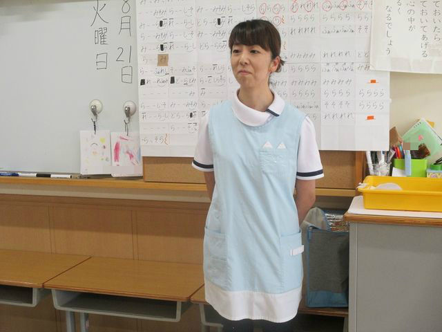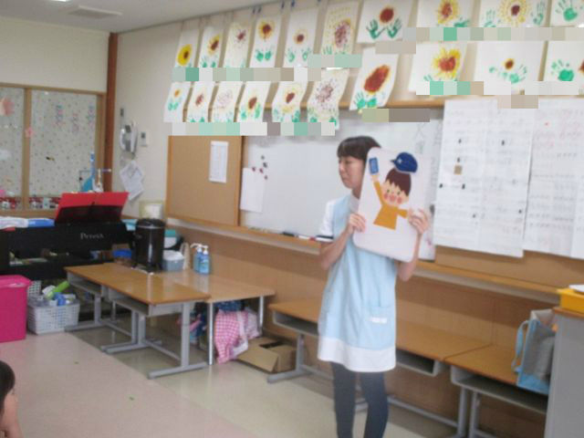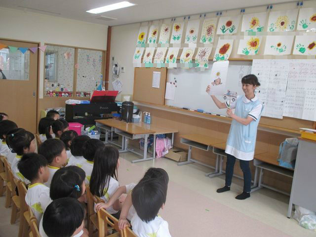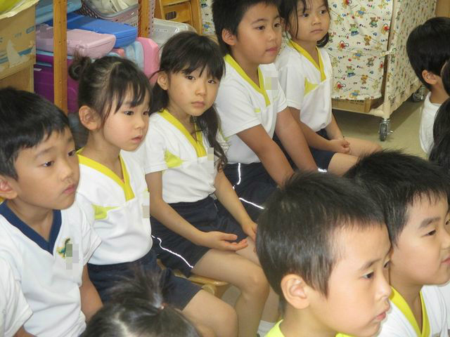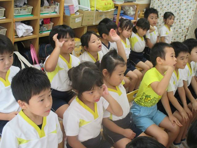 保健シアター 2018年08月22日 昨日、看護師の先生が保健シアターをしてくれました 内容は『熱中症」』です みんな真剣に聞いていますね 水分を摂る事、戸外では帽子をかぶることが大事と教えていただきました では、教えてもらったお約束を守って、戸外遊びをしましょう 戸外遊びの様子は、次のブログで