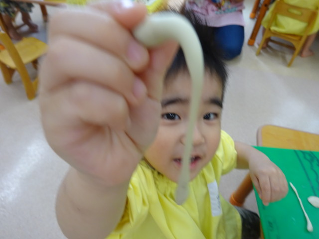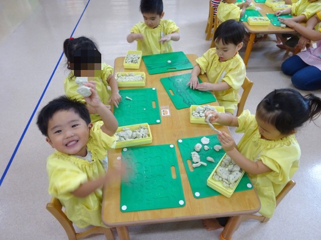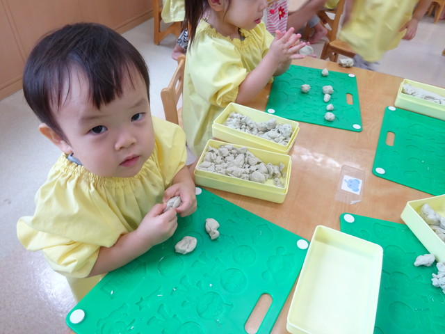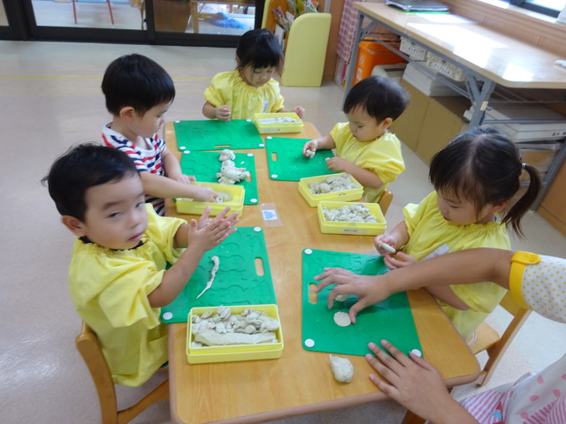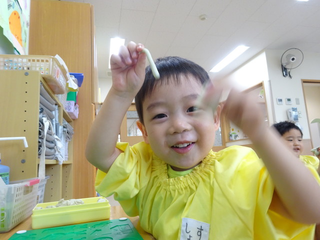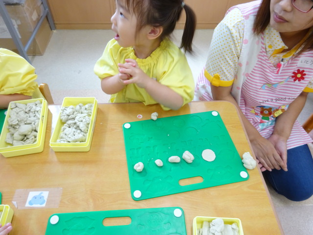 粘土で遊びました! 2018年10月20日 今からみんなで粘土遊びです みんなとっても集中していますね 作ったものを見せてくれました おばけを作ったり ヘビを作ったり ハンバーグを作ったり お店を開いたり うんちを作ったり みんな楽しく遊べました