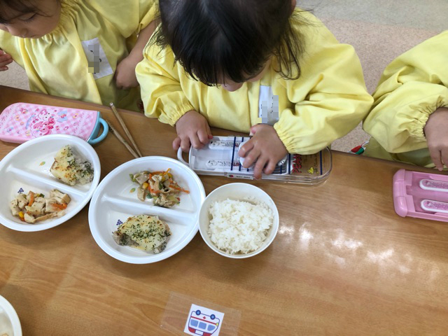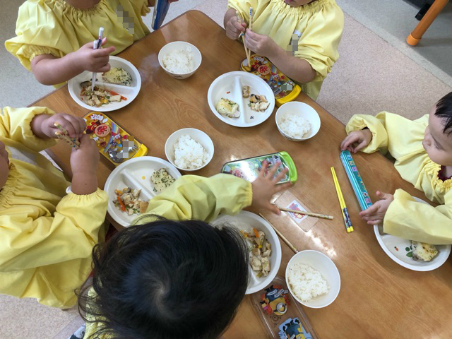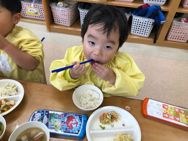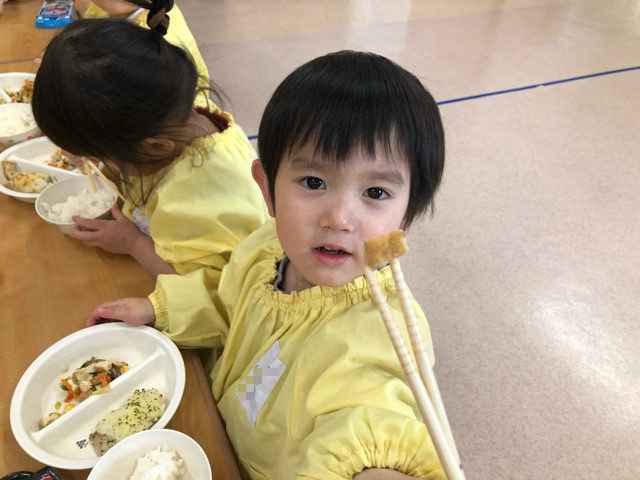 お箸頑張ってます! 2019年01月15日 最近、ぶどう組のみんなは給食の時間、お箸を使って食べていますそれでは「いただきまーす」まずはお箸を出して・・・ 上手に掴めました みんな嬉しそうに「取れたよー」と教えてくれました