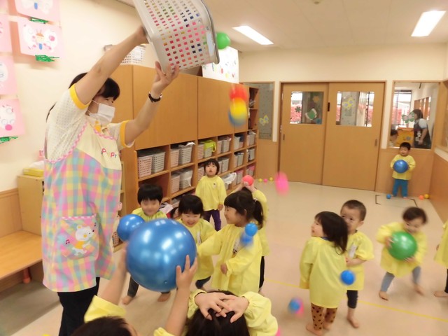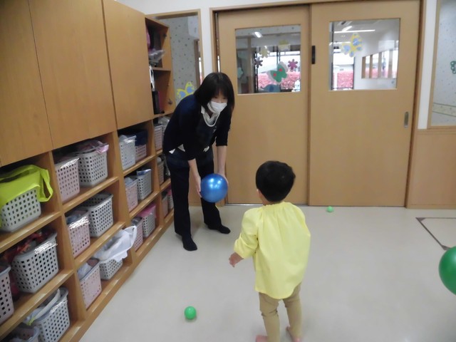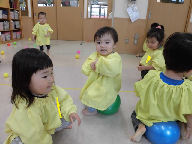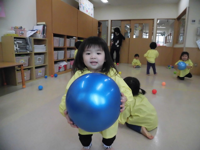 🍇ボール遊び🍇 2019年04月25日 新ぶどう組さんが始まってそろそろ一か月ですね毎日元気いっぱいのぶどうさんです今日はボール遊びをしました 大きなボールの上に上手に座っています 先生にボールの投げ方やキャッチの仕方を教わっています上手に出来たかなー ボールシャワーも大好きです3,2,1の掛け声に合わせて大はしゃぎです せんいみてーと大人気の大きなボールを見せてくれましたまた、遊ぼうね