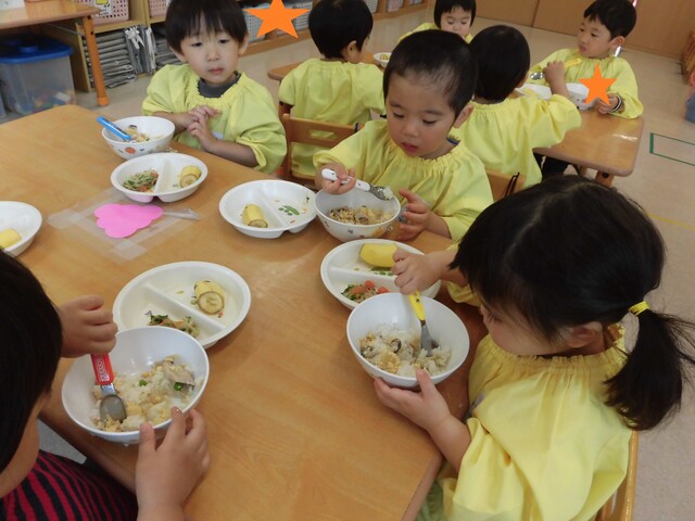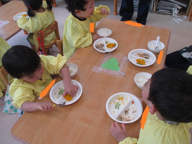 🍇給食🍇 2020年04月27日 ぶどう組になり、早いもので1ケ月が経ちました少しずつ、新クラスにも慣れ、身支度や給食後の後かたづけなど、出来る事も増えてきました 今日は、そんなぶどう組の子ども達の給食の様子をお届けしたいと思います スプーン・フォークを使って上手に食べていますね また、ぶどう組さんの元気な姿をお届けしますお楽しみにしていて下さいね