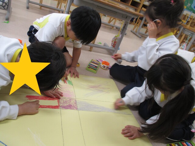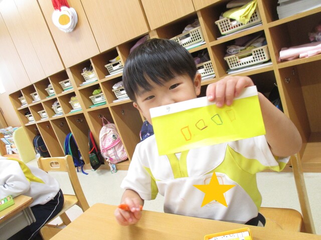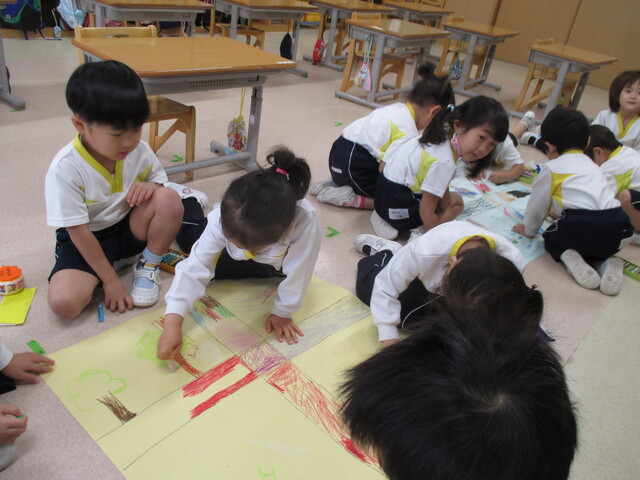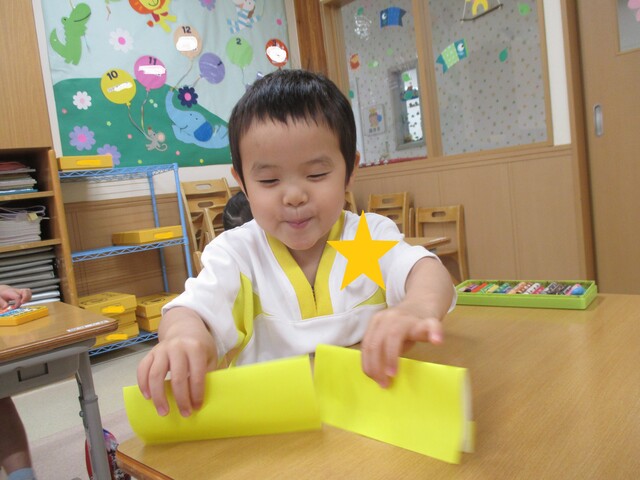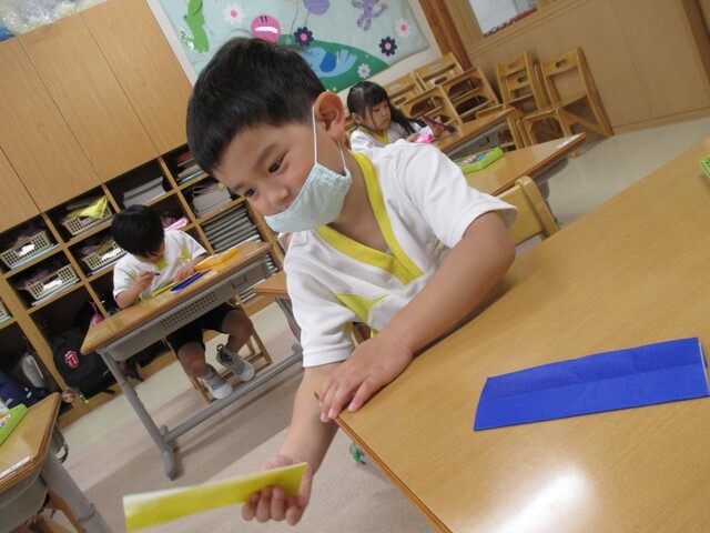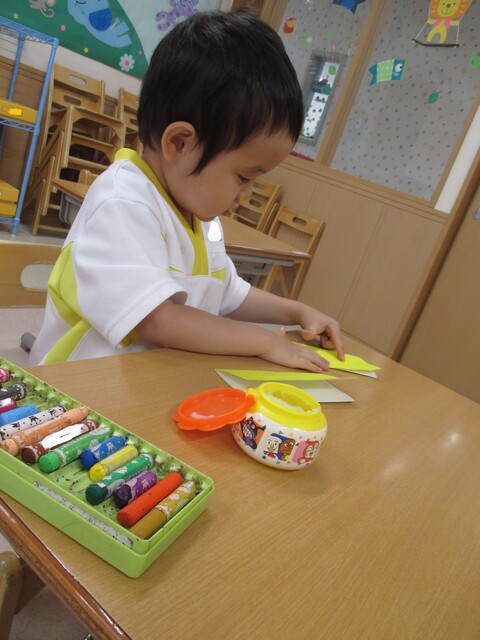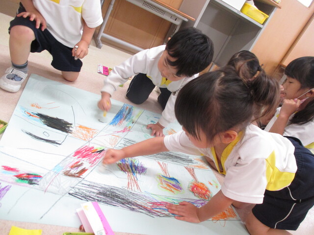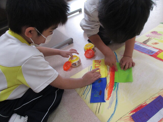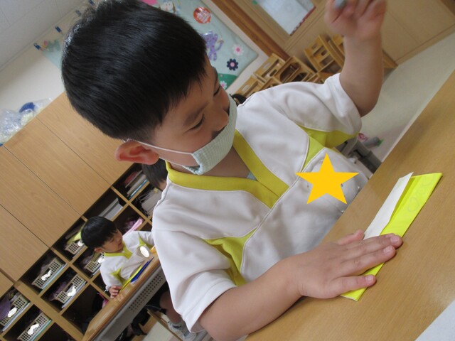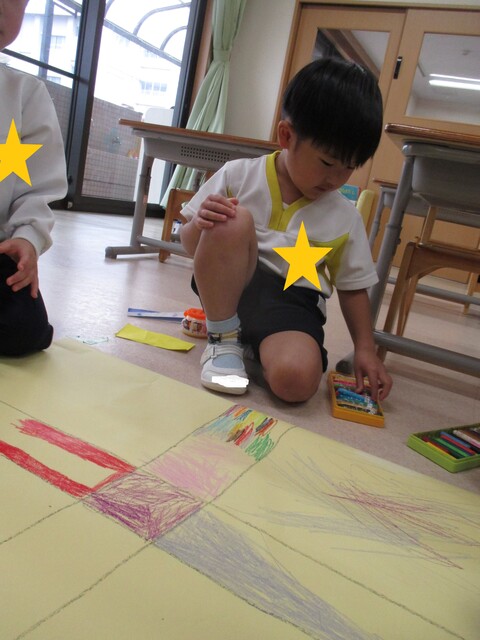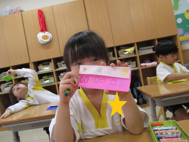 🍌みんなで作りました🍌 2020年05月22日 今回は、製作の様子をお伝えします 折り紙で「バス」を作りました。「どうしようかな~?」 できたよ~ できた【バス】で楽しんでいます そして、のり付け 大きな紙にみんなで貼りました でき上がり 窓に飾ってます