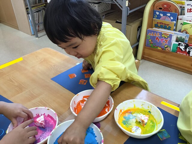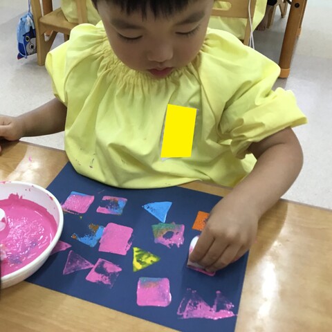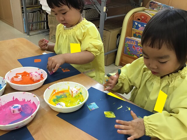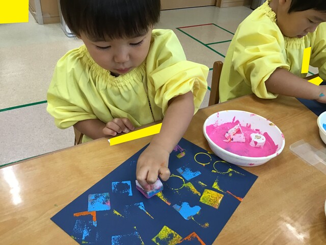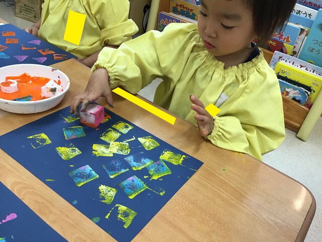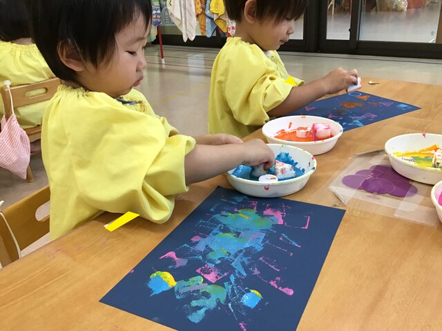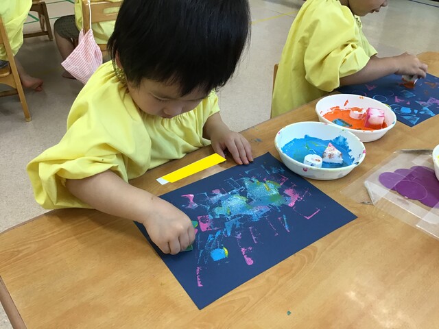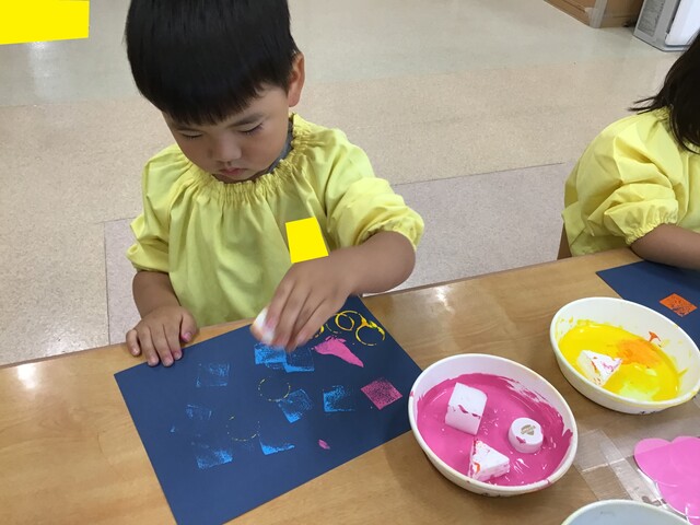 🍇お財布制作②🍇 2020年07月31日 引き続き子ども達の様子をお届けします手のひらでギュッと押したり手を伸ばして気になるスタンプを取ります色も混ざるのも味があって良いですね色んな柄が沢山みんなとても上手にスタンプが押せていますお財布の形に折って完成それぞれ可愛いお財布が出来上がりました夏祭り、楽しかったね