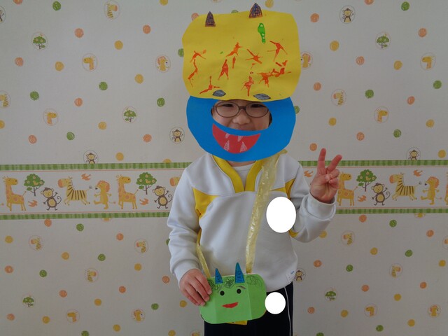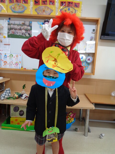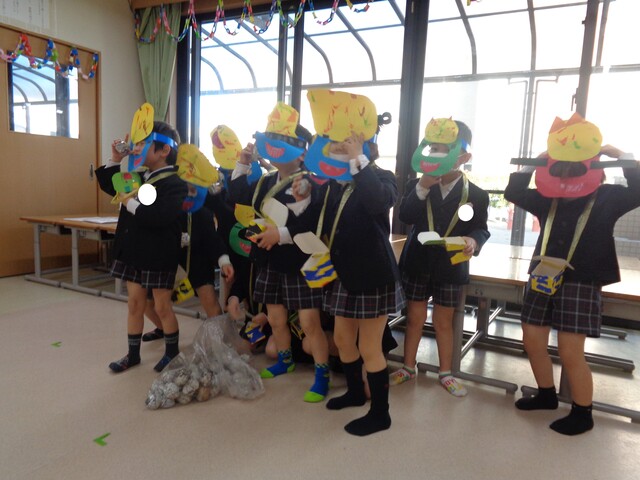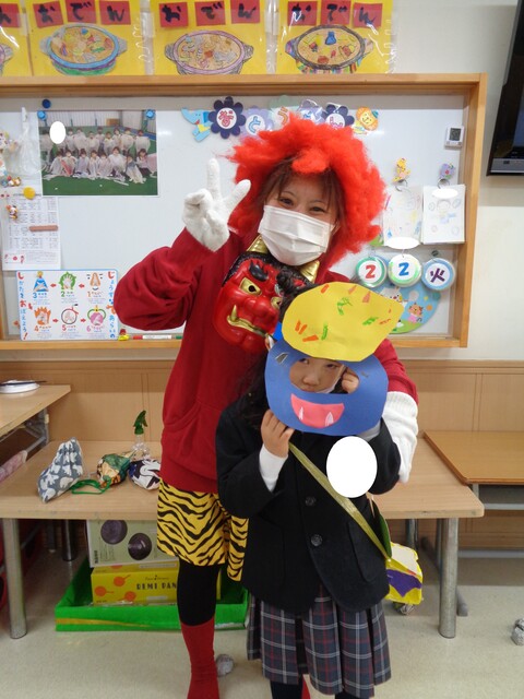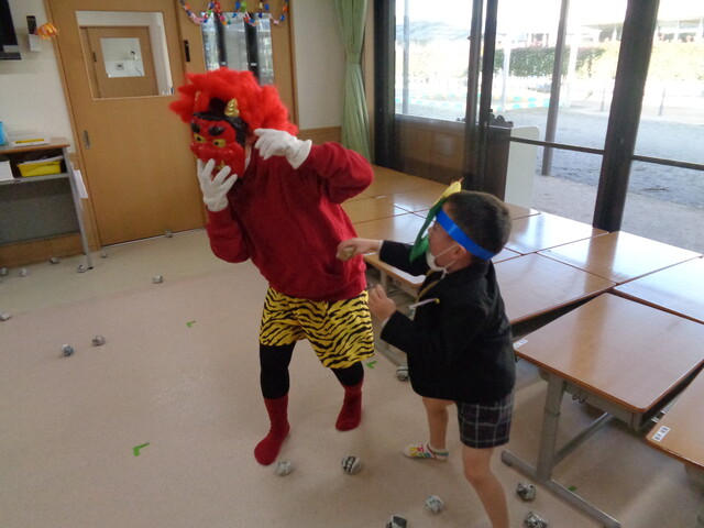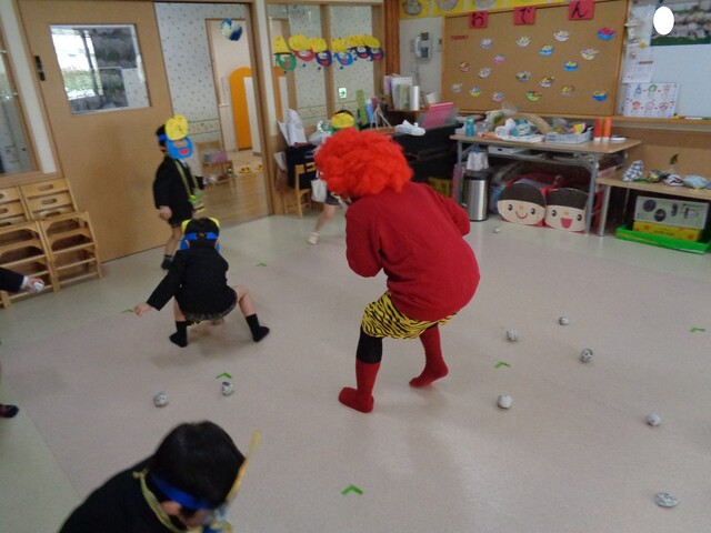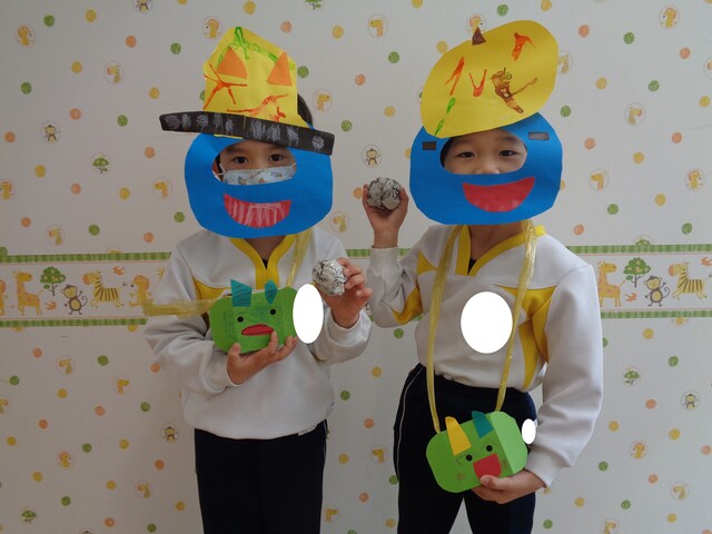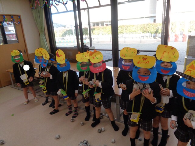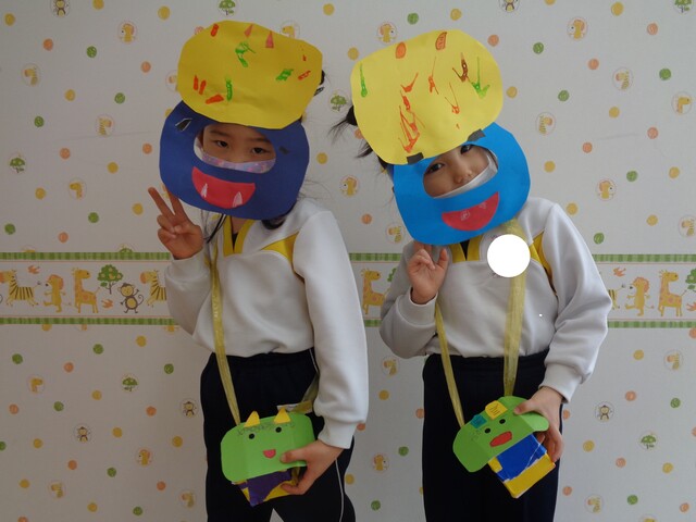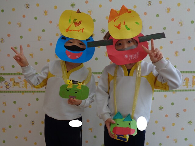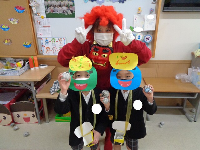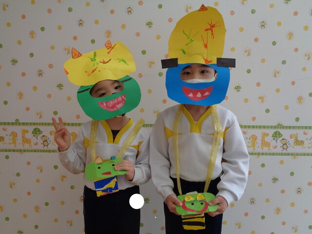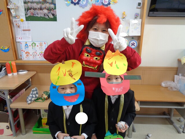🍌節分集会の思い出🍌 2021年02月15日 こんにちはばなな組さんのかわいい鬼さんたち節分製作で、お面と豆入れを作りました 2人仲良く同じポーズ眉毛は一人ひとり好きなように作りました 髪の毛は❛吹き絵❜絵の具をストローでフ-ッと一生懸命、吹きました顔は好きな色を選びました 豆入れも個性が感じられます角もオリジナルです いよいよ本物の鬼さんが!!!!!豆(新聞紙)準備OK 表情がだんだんと固まってきています 気合もバッチリ『キャー』『こわい~』『!!!!!!!!!!』『泣』と…大騒ぎでしたが、勇気を出して頑張るお友だちも最後は、鬼さんとも仲良しになりました 今でも…時々この日のことが話題になります(笑)