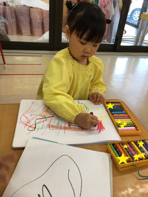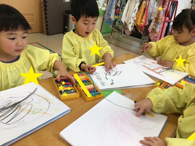ダイナミックに画用紙いっぱいに描いたり、好きな物を描いたり![]()