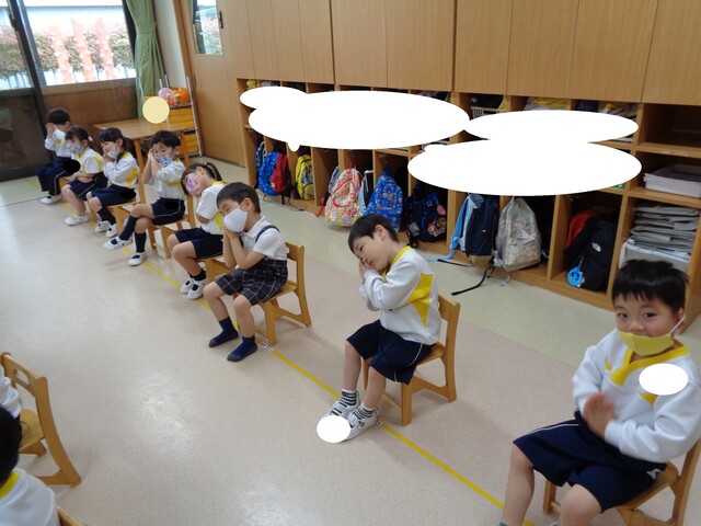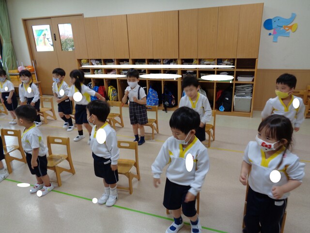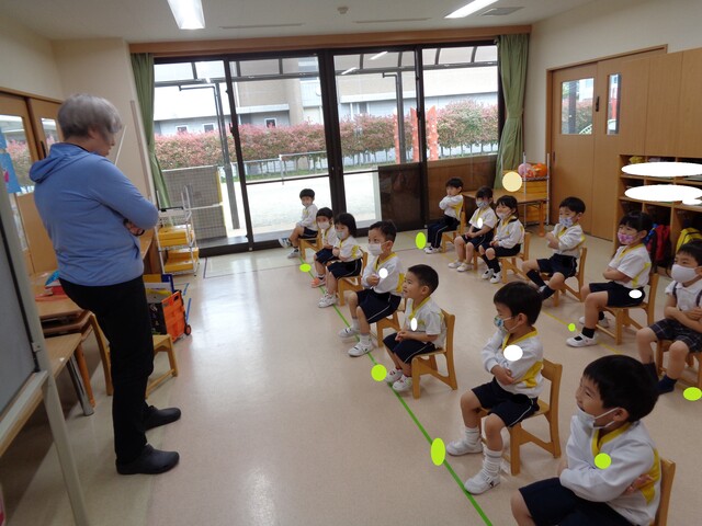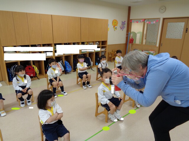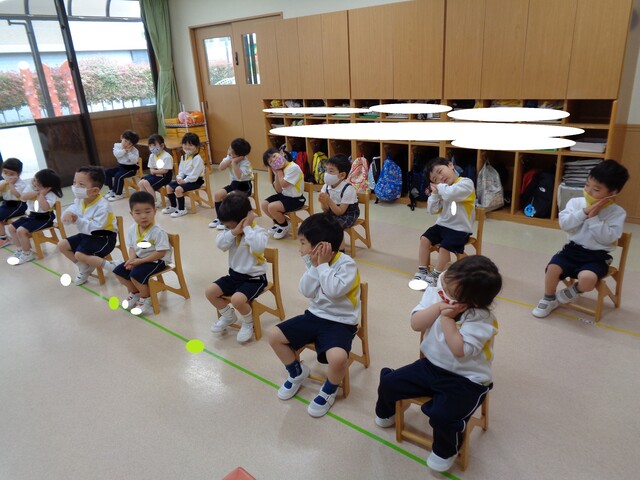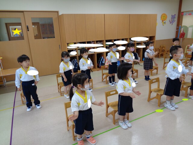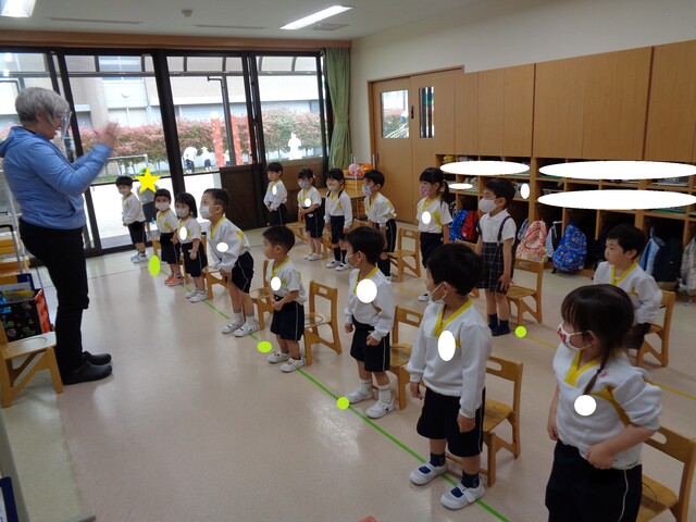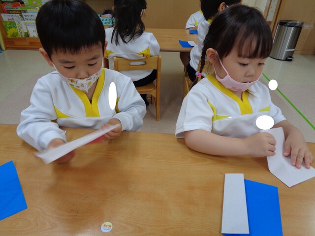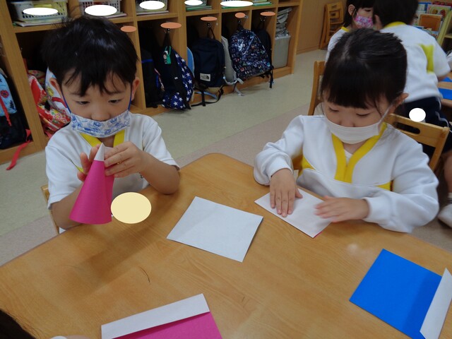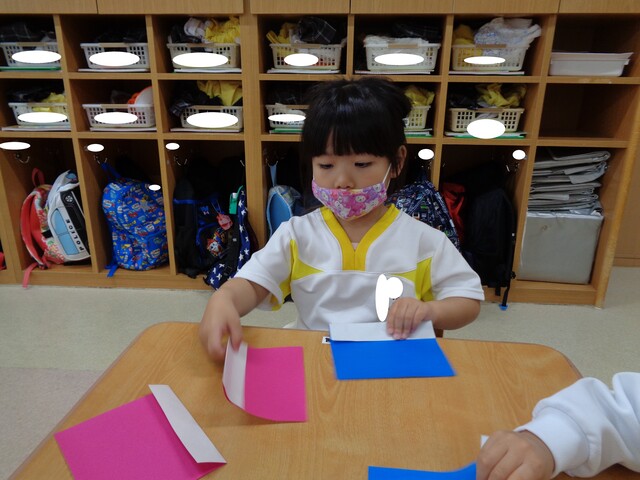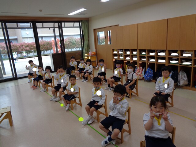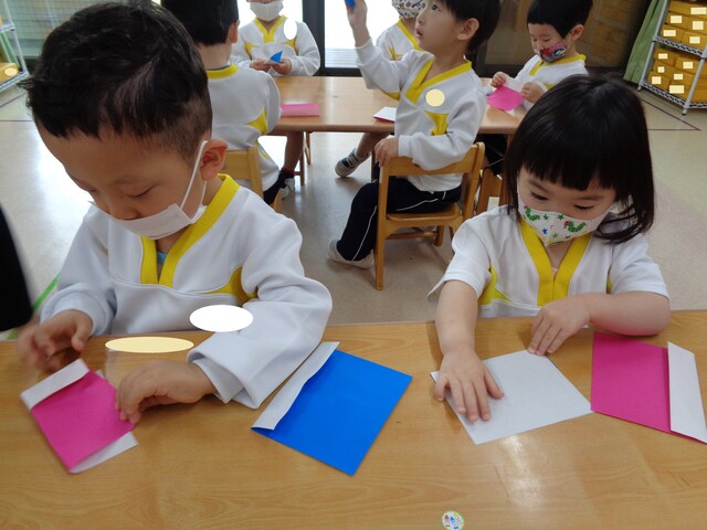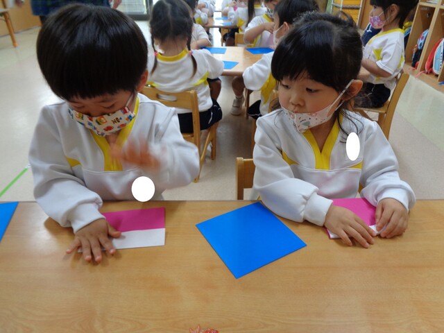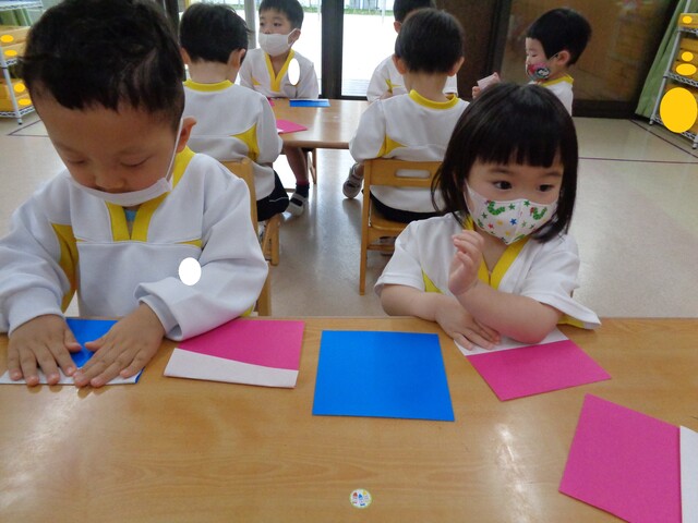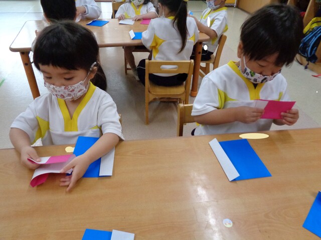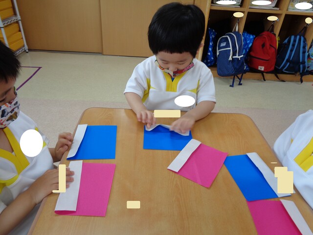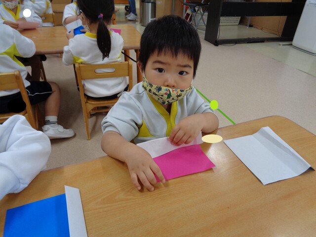 🍎初めてづくし🍎 2021年05月24日 5月の製作では、りんご組になって、初めて折り紙に挑戦しました重ねたり、合わせたりと一生懸命に取り組みました。真剣な表情です 上手に「こいのぼり」の折り紙が仕上がりました。 次の初めては、英語ですリンジー先生の英語をとても楽しみにしていた子ども達「ウキウキ」「ワクワク」「ドキドキ」の様子 とても楽しい時間でした。これからも、たくさんの初めてを経験していきたいと思います。