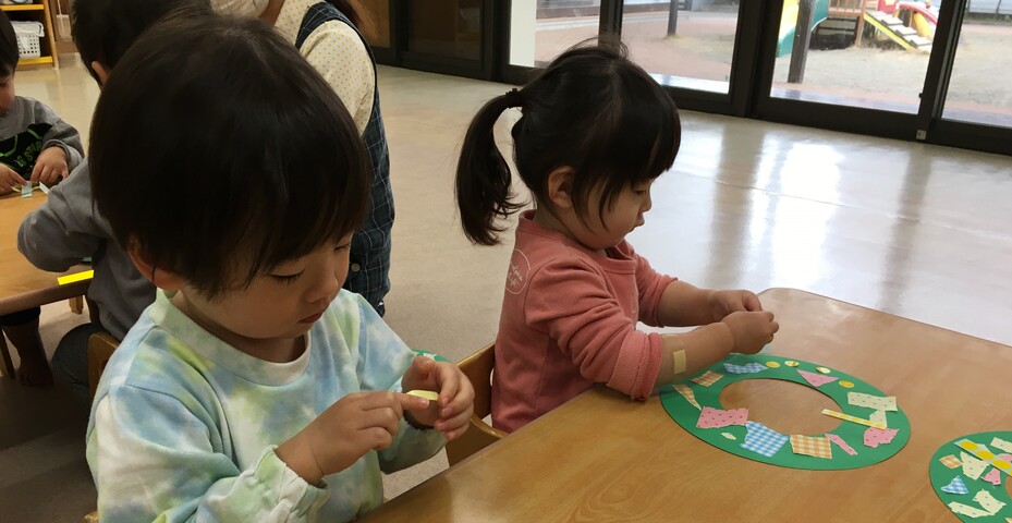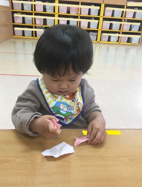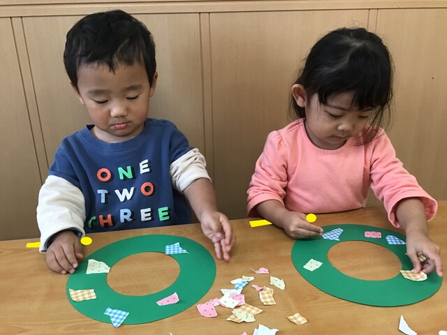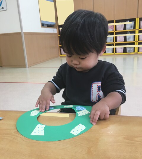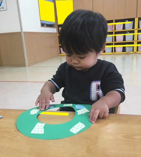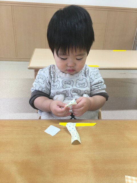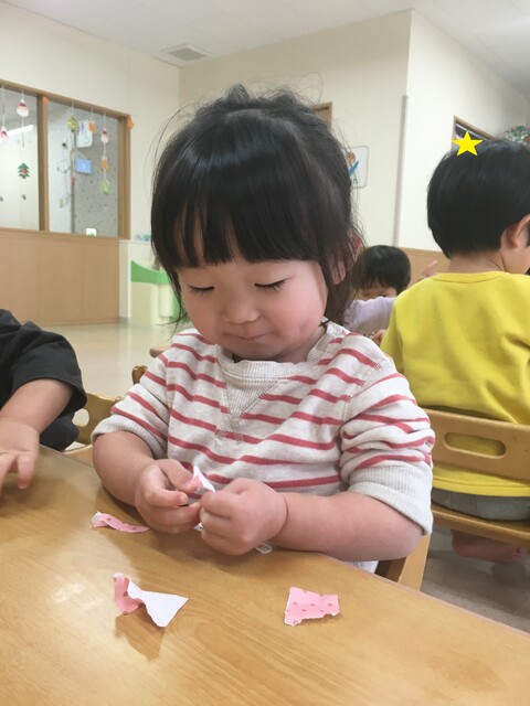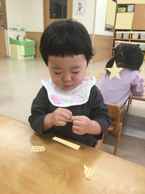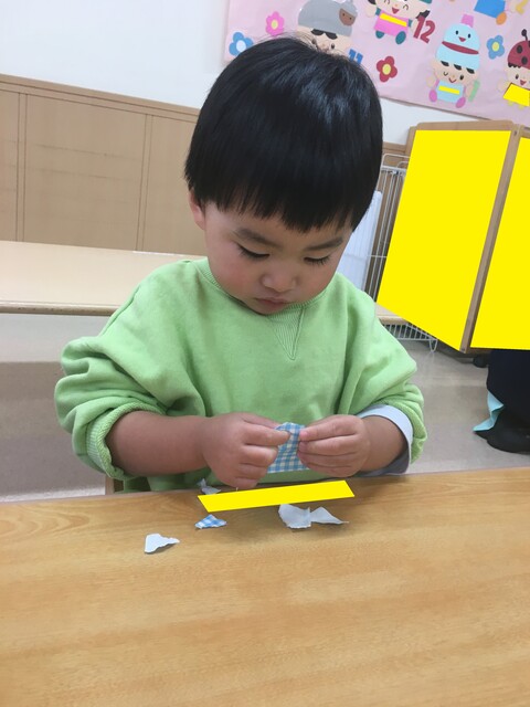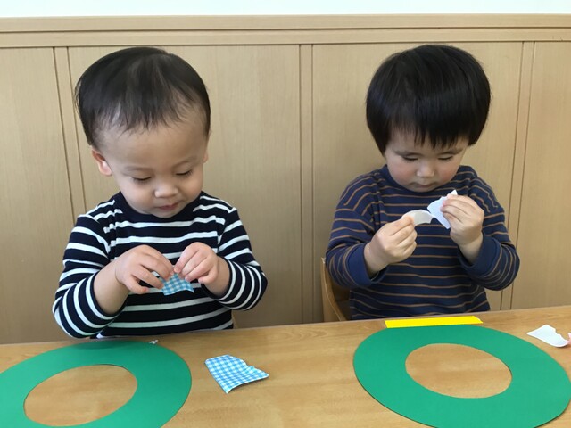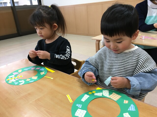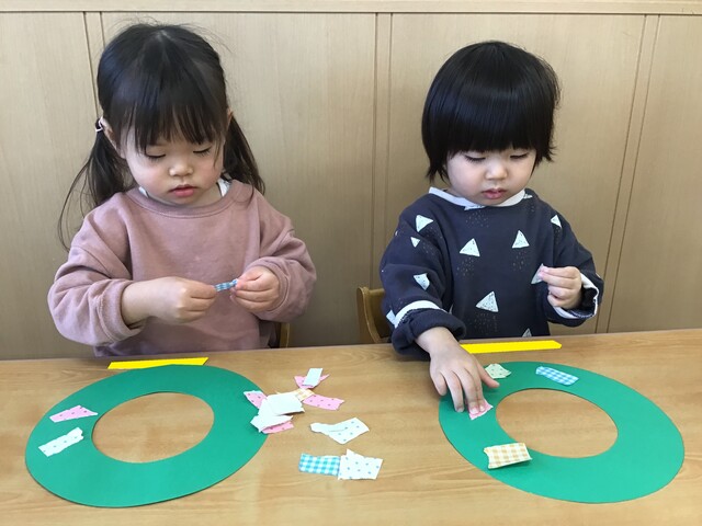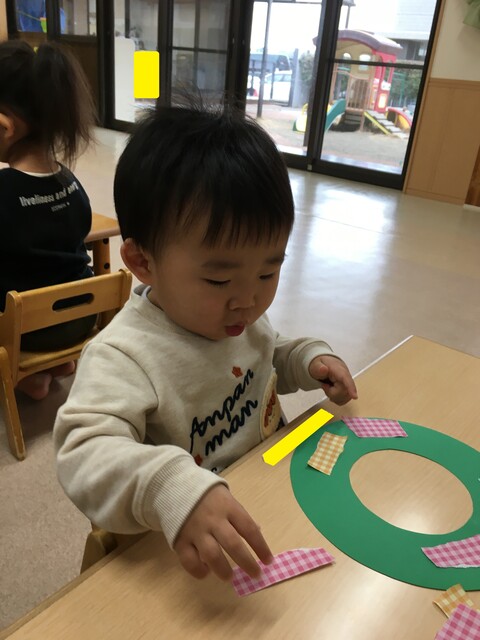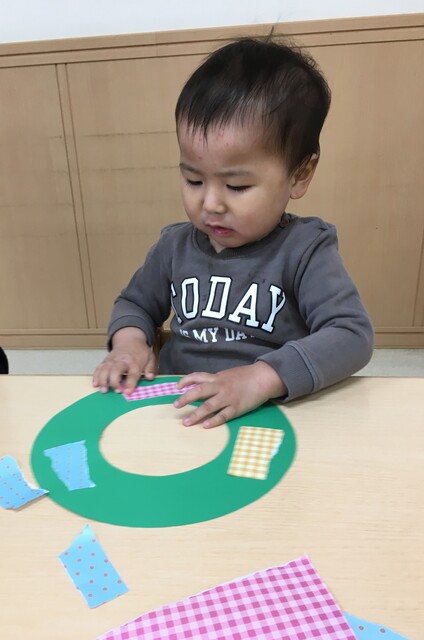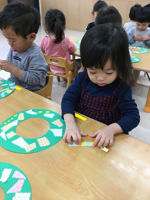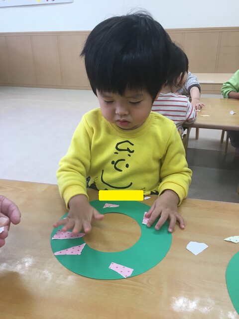 🍓🎄クリスマス🎄🍓① 2021年12月27日 クリスマス会に向けて作ったオーナメントの様子をお届けします 初めに、折り紙を千切りました真剣な表情、、手元をしっかり見て、とても上手に千切れていますのりを付けてもらって、好きな所にぺったんバランスを見たりしながら上手に貼れています最後に黄色のシールを貼って、デコレーションしました自分で剥がして、上手に貼れています完成クリスマス会当日は、ツリーに飾り付けしましたみんなとても上手に出来ました