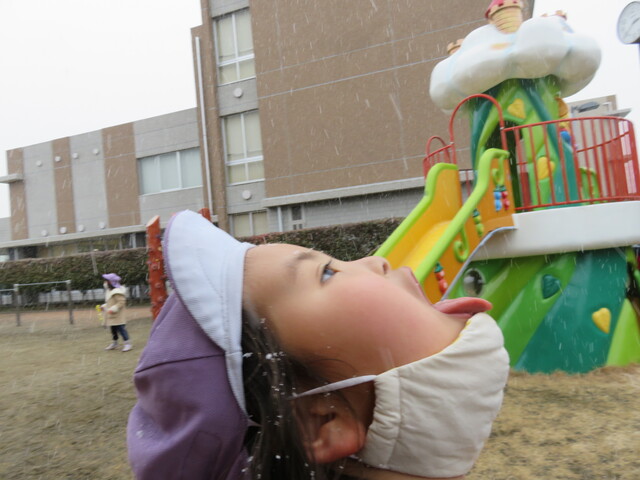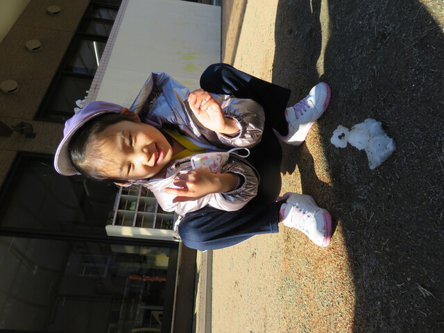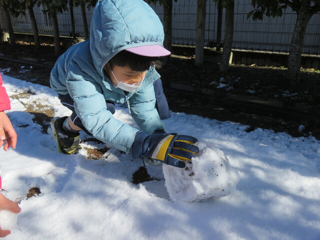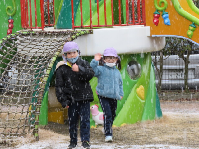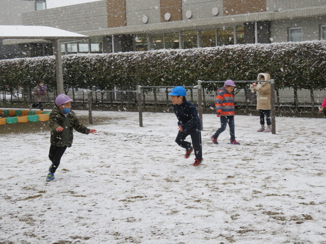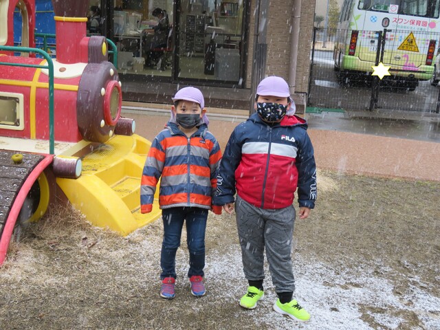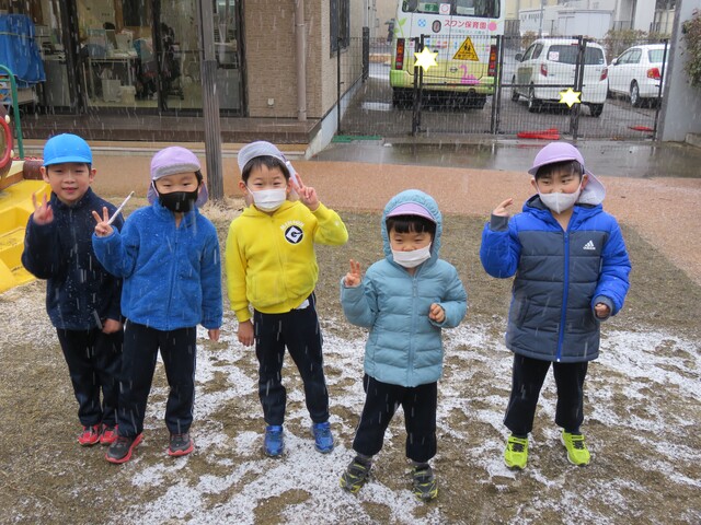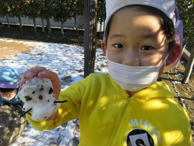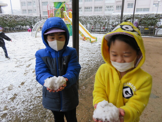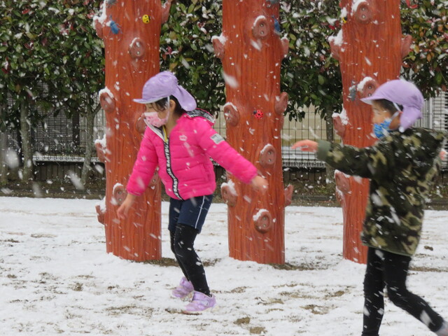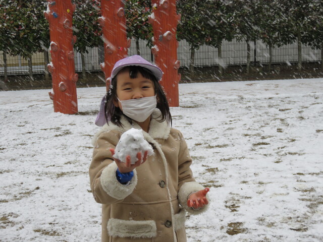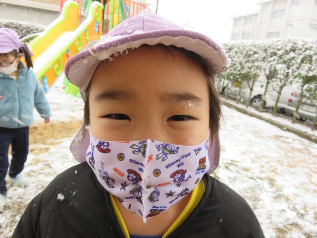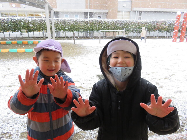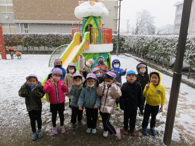 🍋新年🎍初雪⛄🍋 2022年01月07日 明けましておめでとうございますあっという間に新年を迎えました元気に登園してくれたみんなへのプレゼントのように初雪が舞いましたね大人にとっては何かとやっかいな降雪ですが、子ども達にはただただ楽しいサプライズです 6日には4回もお外に飛び出し、景色がどんどん変わっていくのを驚きながらも楽しみました。 髪の毛に付いたよ~ お顔に付いたよ~ 頭に積もったよ~ ま、まゆげにも・・・ お口でキャッチできるかな!? ああっ そーっと味見しているな・・・ 冷たいよ~ 冷たい冷たい もみじのおててが真っ赤です 雪合戦は、敵も味方もなく、ただただ個人戦が行われた模様… 一夜明けた7日は、気持ちの良い晴天!早く遊ばないと、溶けちゃうよ~音楽とSTが終わると同時に、お外に飛び出しました 雪だるまつくろう♪ 久しぶりのお友達も元気です 小さい⛄ゆきだるま 大きいゆきだるま⛄ みんな、自然からの贈り物を目一杯楽しみました