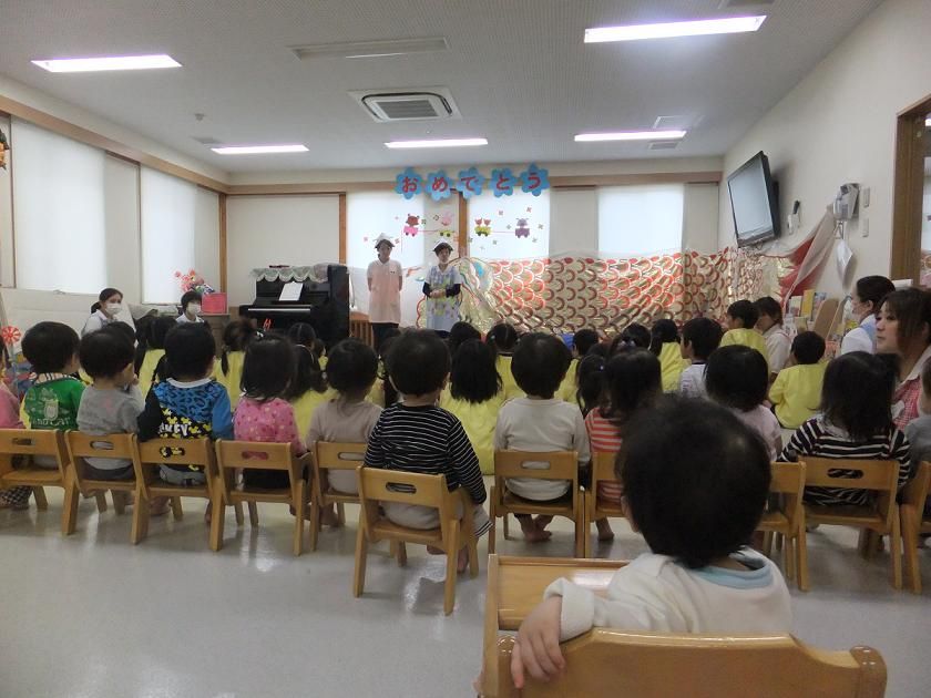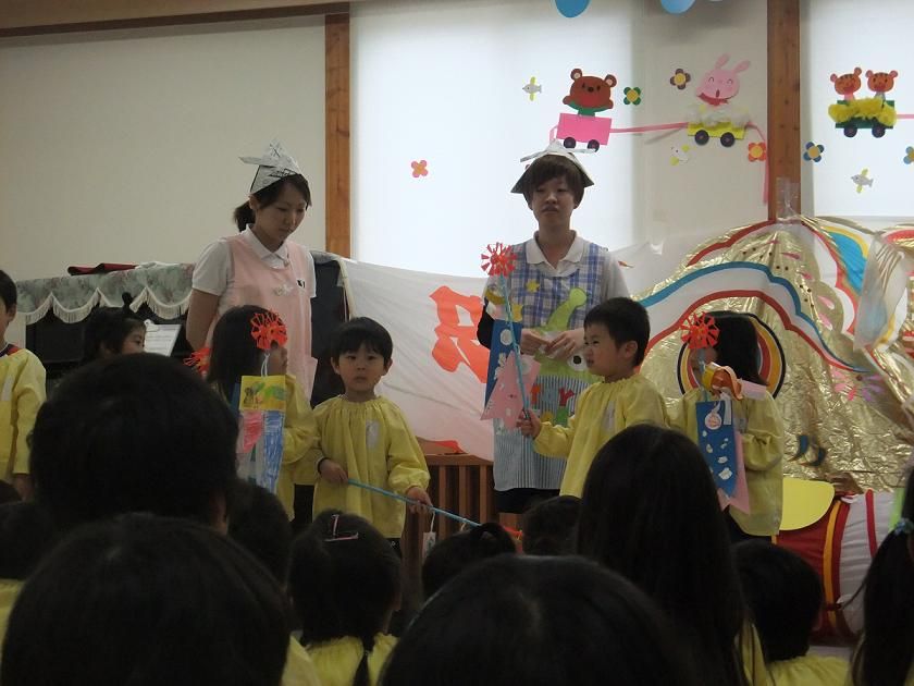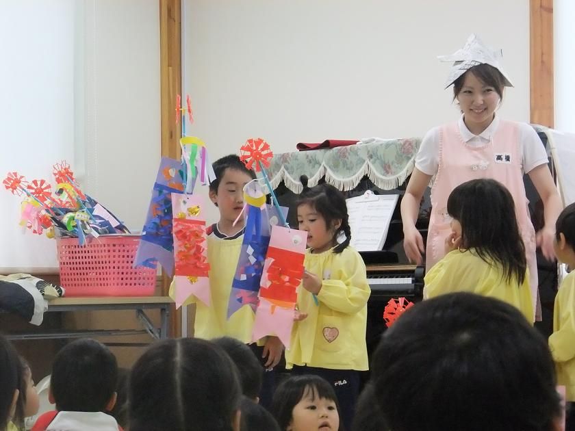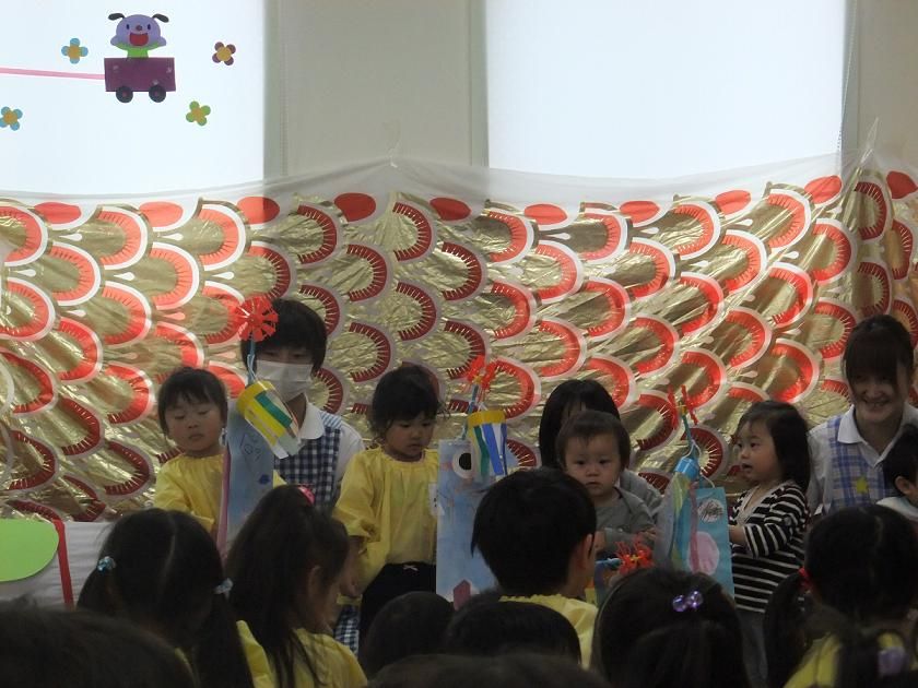 こどもの日祝会(^-^) 2012年05月02日 本日、こいのぼり祝い会がありました 職員が新聞紙で作ったかぶとをかぶり、みんなに話しをしましたこどもの日の由来などを真剣に聞いています 各クラスのこいのぼり紹介