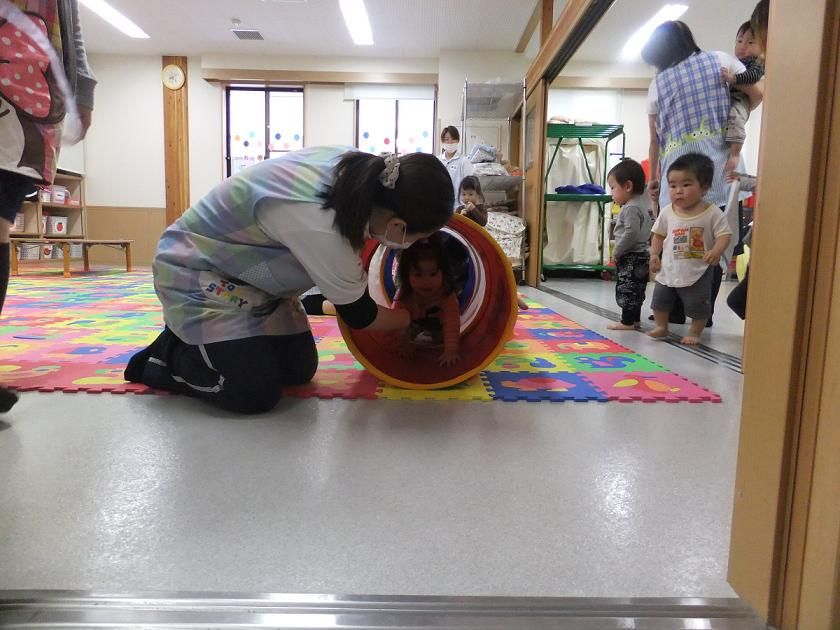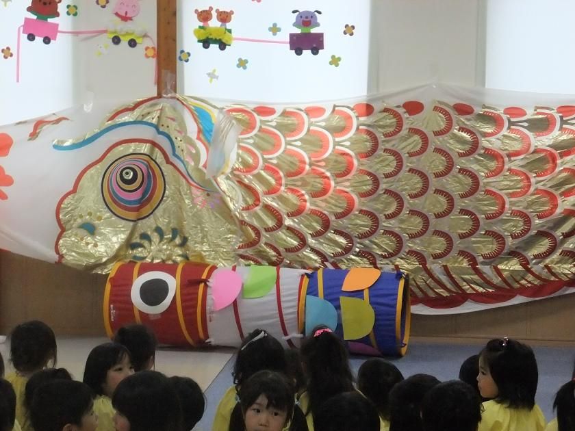 こどもの日祝会・2(^O^) 2012年05月02日 最後に、こいのぼりの中をくぐりました いちご、ぶどう、めろんぐみはトンネルをくぐりましたみんなニコニコです りんご、ばなな、れもんぐみは大きなこいのぼりの中をくぐりました 大興奮の子どもたちです