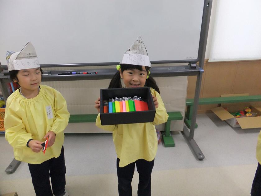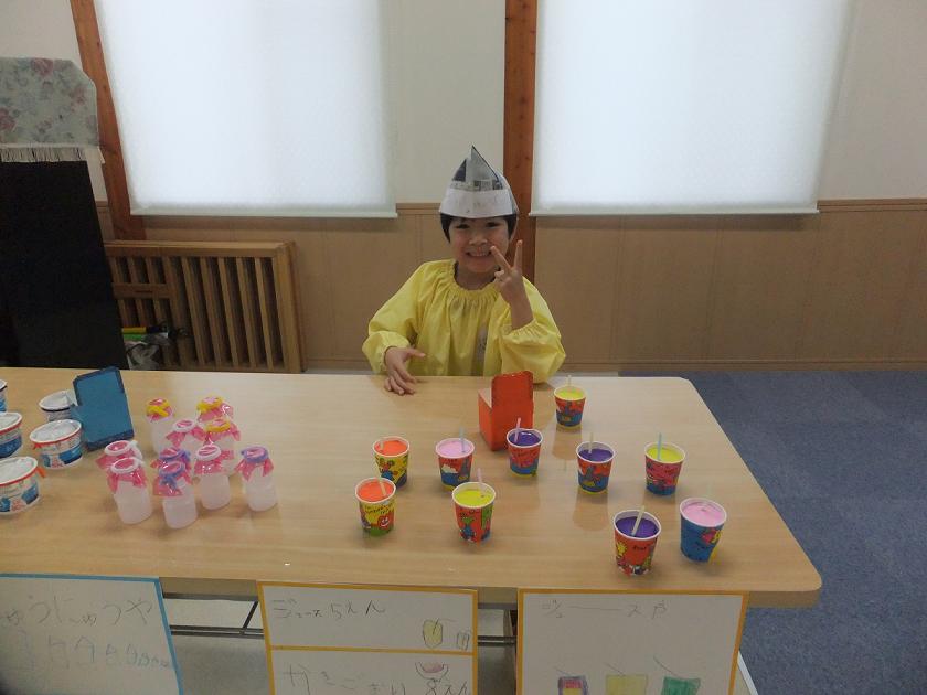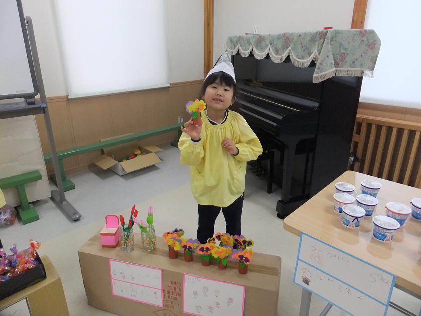 お店屋さん(*^_^*) 2012年11月07日 先日れもんぐみが学習の中でお店屋さんごっこを行いました ジュース屋さんですピースが決まっています お花屋さんですかわいいお花がたくさん並んでいますね おかし屋さんですいろいろな色のチョコレートが入っていますおいしそうですね いろいろなお店があったのでまた紹介します