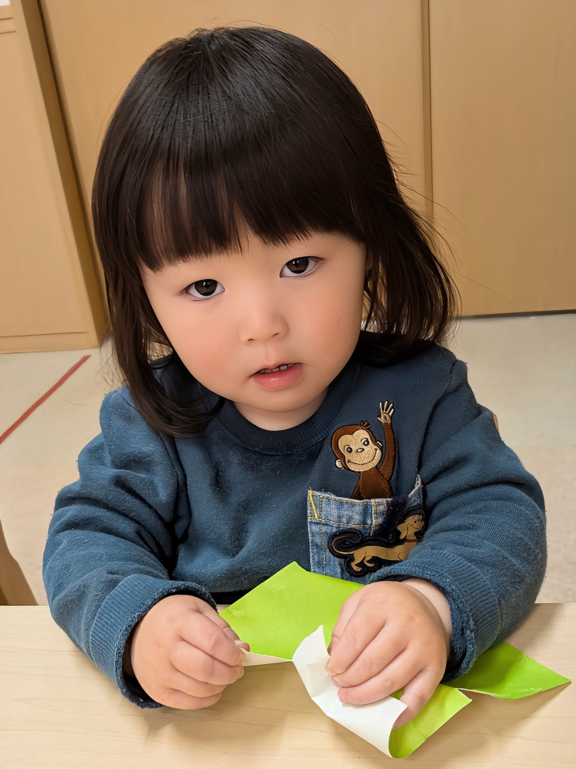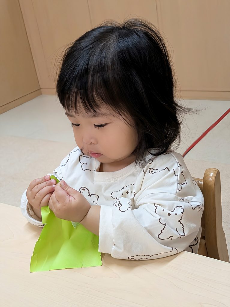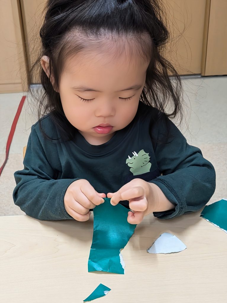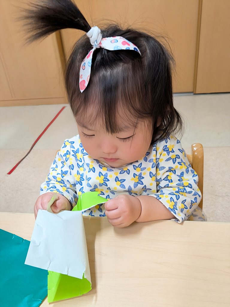 まずは、黄緑と緑の折り紙をビリビリと破きます。