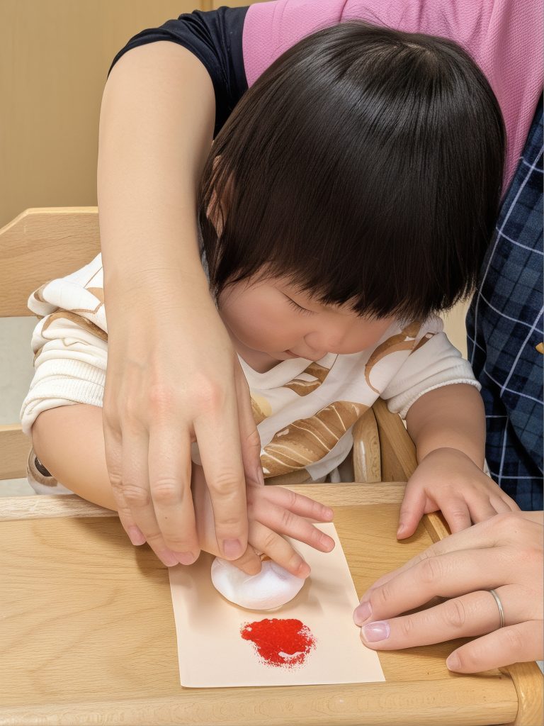 次に、肌色の画用紙に、たんぽで赤と白の絵具をスタンプします。