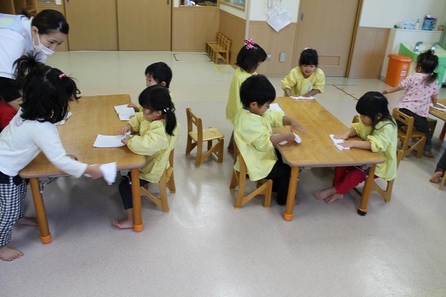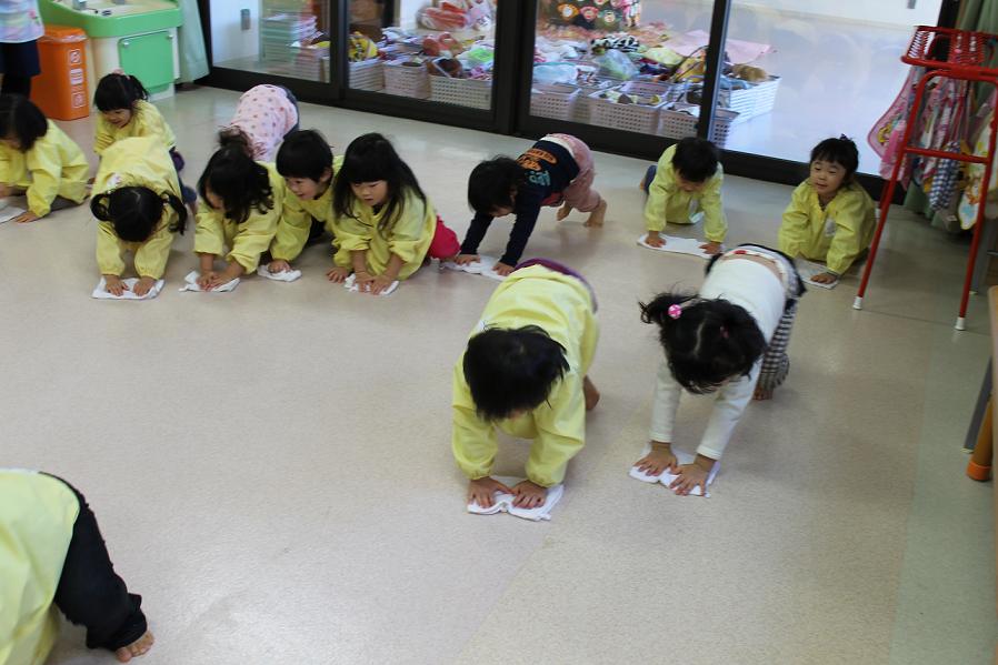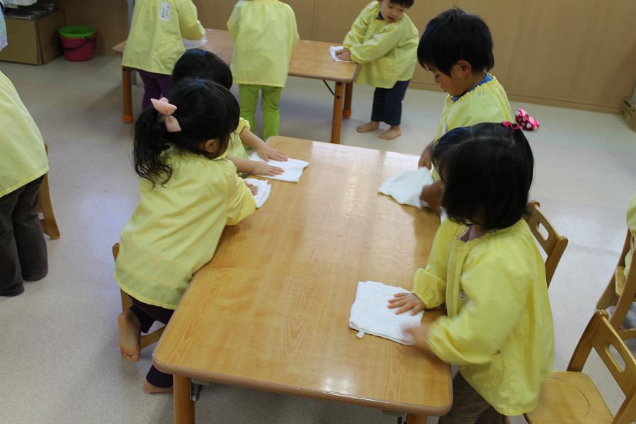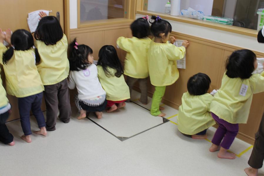 ☆年末大掃除☆ 2012年12月29日 今年も残りわずかとなりましたね 各ご家庭でも、大掃除に忙しい時期!!保育園の子ども達も、お休みに入る前にクラスのお掃除をしました(^∀^) ▼2歳児(ぶどう組)の様子です 1人づつ雑巾を持って、テーブルをゴシゴシ… 毎日座っているイスも念入りに… ロッカーの荷物をどけて、背伸びをしながら奥の方まで… お部屋の壁も…雑巾の裏を見ながら、『わ~!!まっくろ』との声も(`・ω・´) 床の雑巾掛けは、みんなで一緒に… ヨーイ、ドン 窓拭き キュッキュ 裏から見ると… 一生懸命な姿が可愛いですね☆ヽ(・ε・)人(・ε・)ノ おかげで、クラス中がピカピカになりました