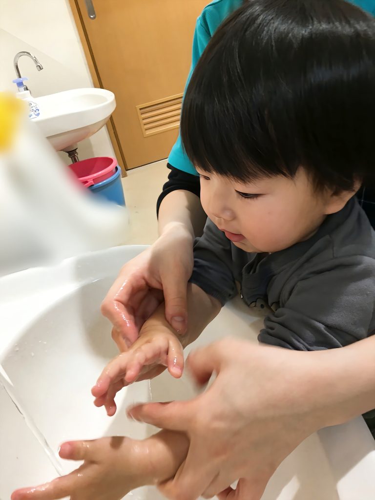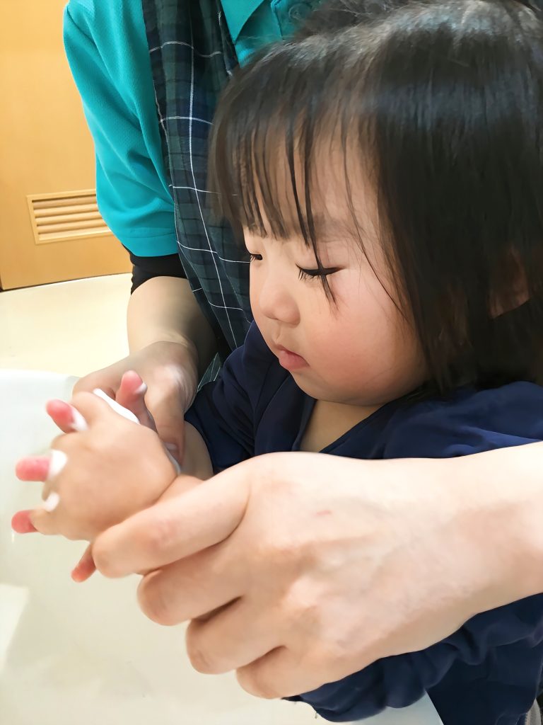 手✋🏻に石鹸🫧を付けたら、先生と一緒にお手てをゴシゴシ。