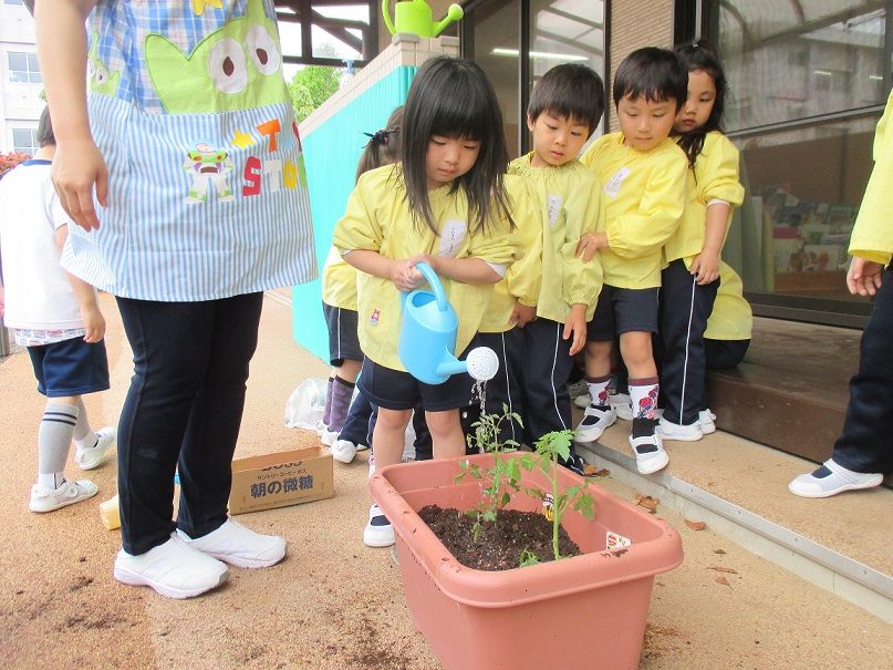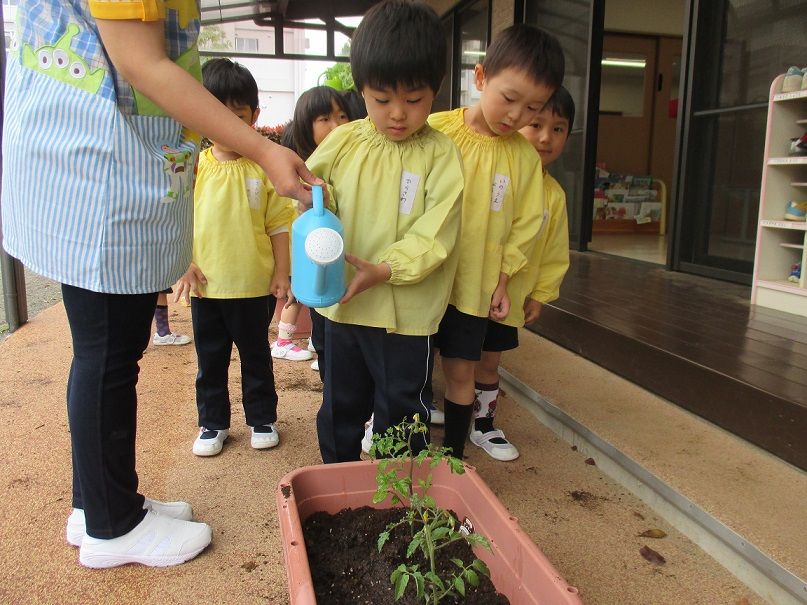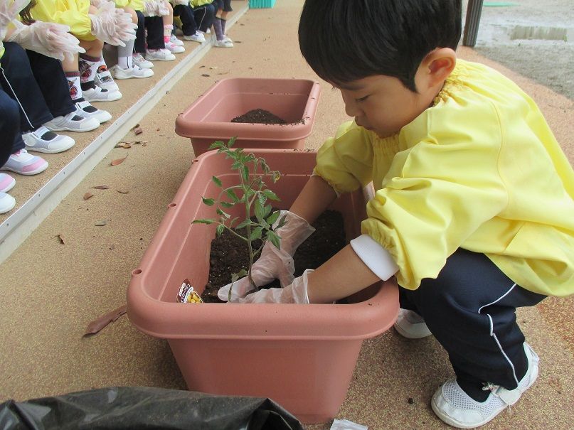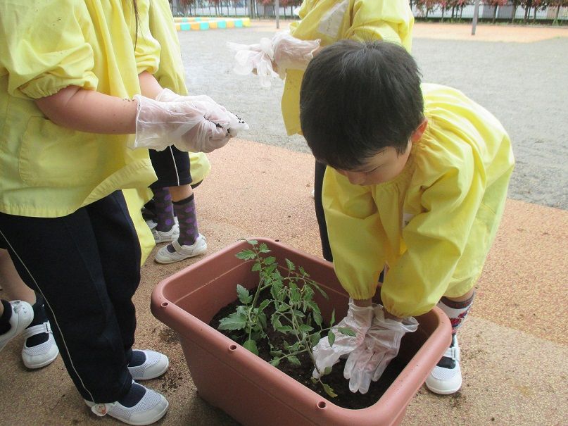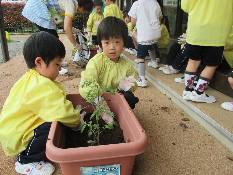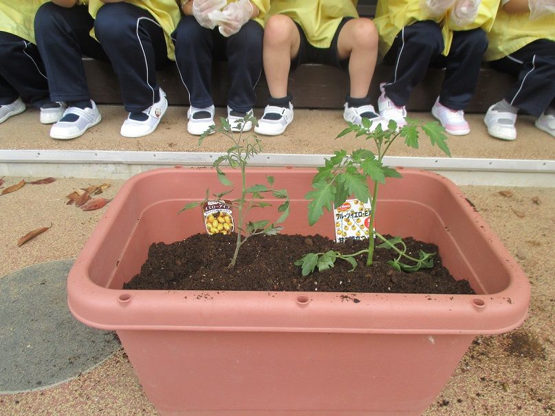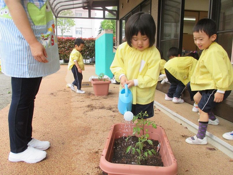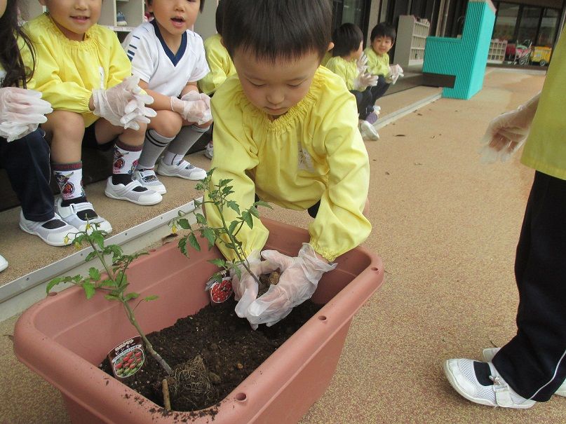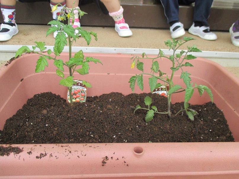 🍅トマトの苗植え🍅 2016年05月10日 本日、ばなな組で、【トマトの苗植え】をしました アイコ・イエローアイコ・フルーツイエロー・ピンキーの4種類を植えました(全て、ミニトマトです) 手袋を装着 肥料と苗を鉢に入れて… みんなで出来るよう、順番に行いました 完成 最後に、たっぷりのお水をあげました 『大きくな~れ 大きくな~れ』 毎日の水やりを忘れず、美味しいトマトを育ててね