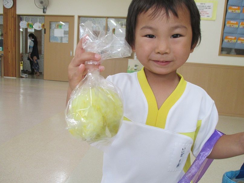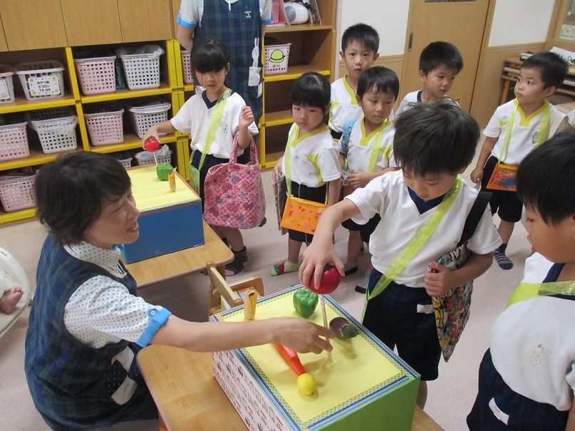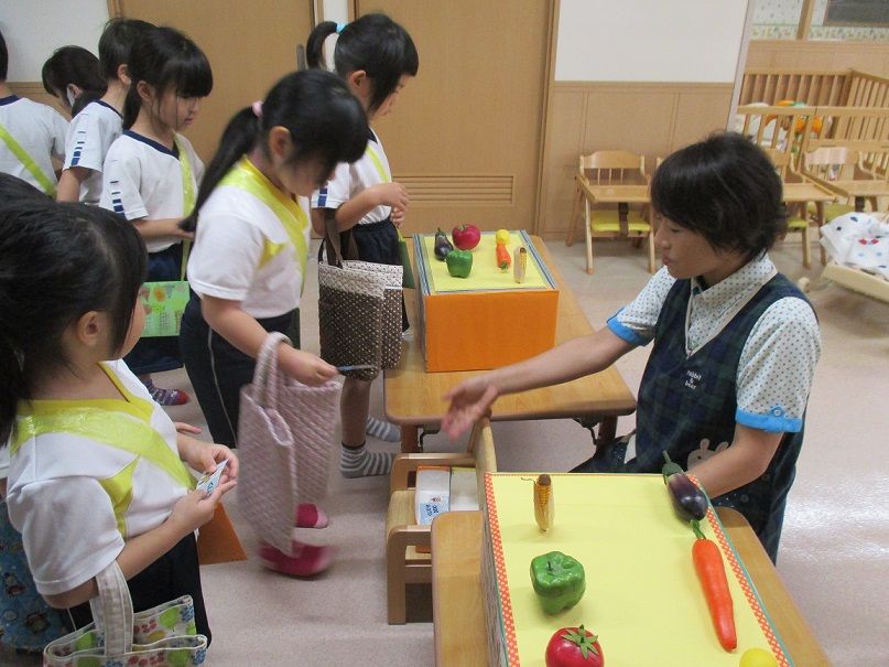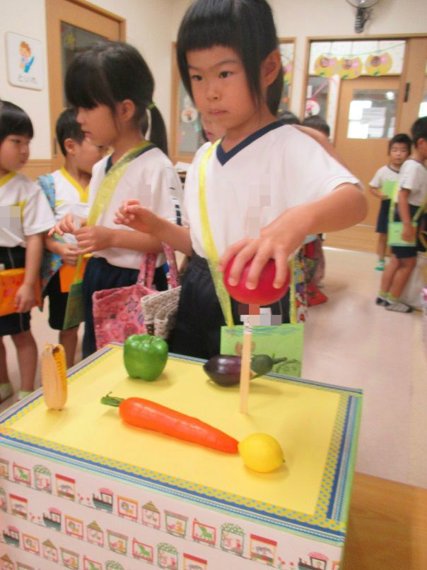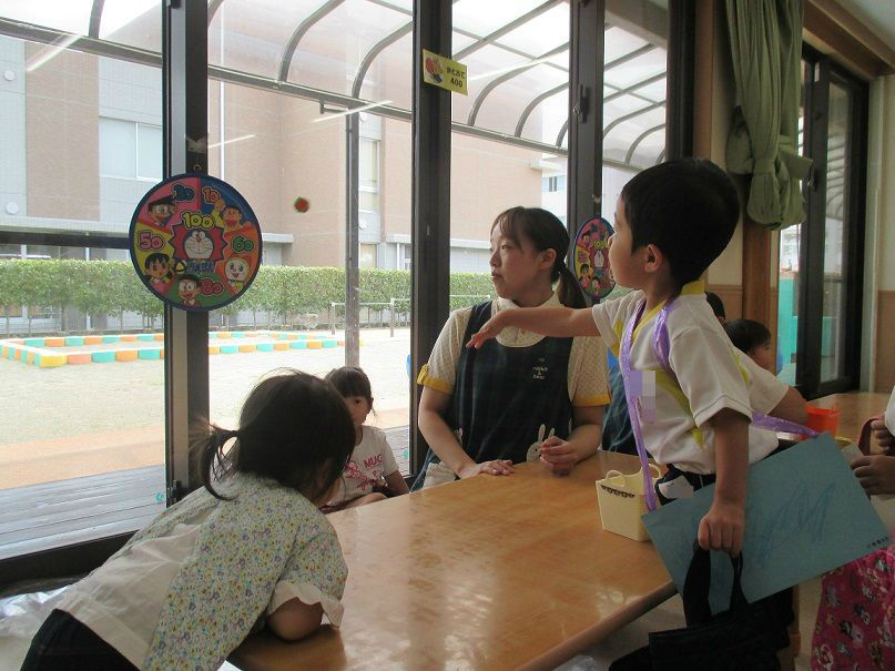 園内夏祭り① 2016年07月21日 “夏祭り”といういことで、甚平を着て登園してくれたお友達もいましたみんなお似合いで可愛かったです さぁ、いよいよ夏祭りスタート各クラスで設定したお店屋さんに順番に行きました まずは、くじ屋さん お野菜で出来たくじを1つ引いてもらい、棒の部分に書いてある動物の名前のヨーヨーをもらいます みんな、何の動物が当たるかドキドキ たくさんの種類のヨーヨーみんな喜んでくれました 次は、的あてこのドラえもんの的めがけて、ボールをポ~ン 集中して上手に投げていました 景品は、わたあめ このわたあめは、綿に絵の具のスプレーを吹きかけモミモミ…この日の為に、みんなで色とりどりのわたあめを作ったのです 続く…