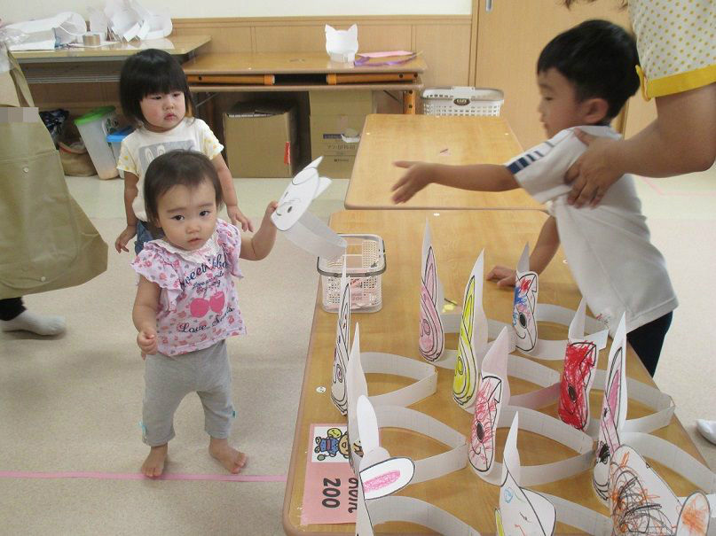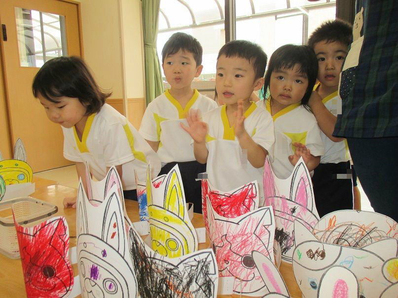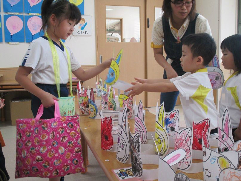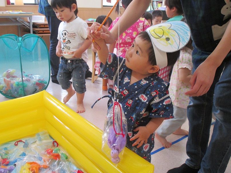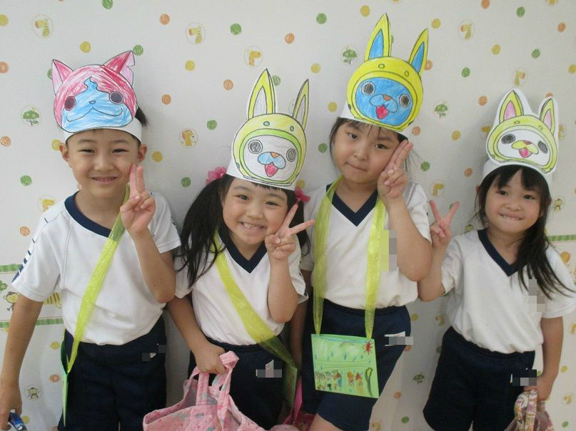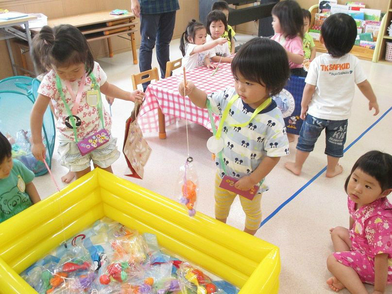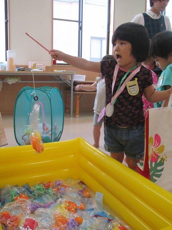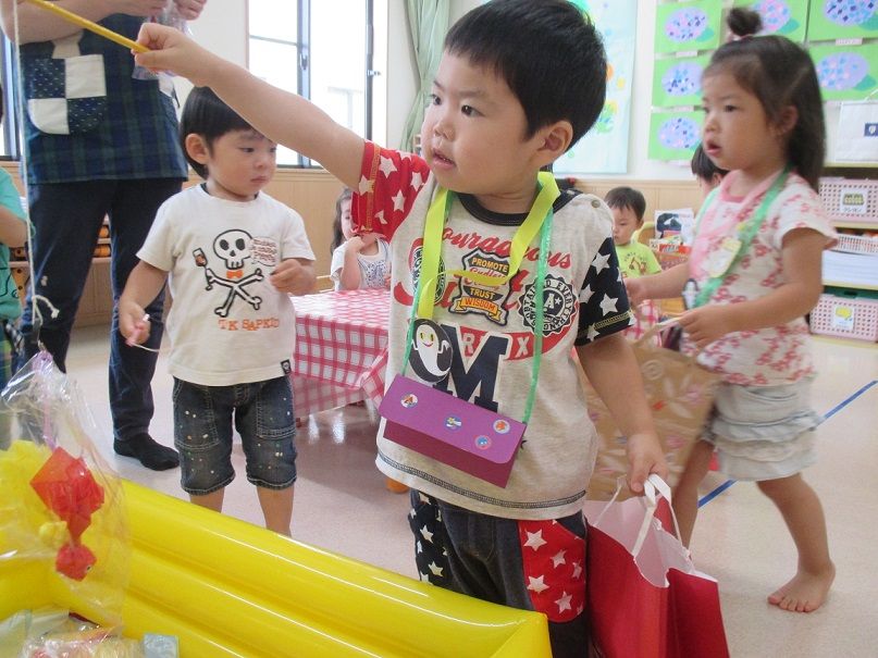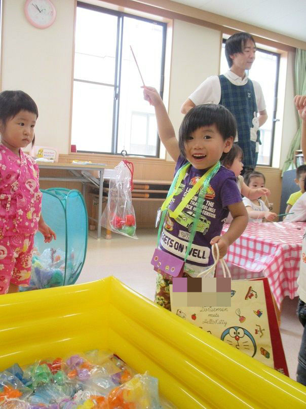 園内夏祭り② 2016年07月21日 続いて、金魚釣り ティッシュを丸めて、花紙で包み、おめめのシールをペタッこれも事前にみんなで作った金魚さんです袋に入れると、本物みたい 釣り竿を持って、慎重に・慎重に…小さいクラスのお友達は、先生と一緒にやりました コツをつかむと、次々に『釣れた~』との歓声がありました 続いて、お面屋さん これも事前に、1人1人が塗ったもの自分のお面を買いに行きました お店屋さんに扮したお兄さん・お姉さんも『いらっしゃいませ~』と大きな掛け声 受け取ったお友達も嬉しそうでした 無事に買えて、頭に装着 『ボクもせんせいと一緒にぬったんだよ~』 以上児クラスのお友達は、妖怪ウォッチのキャラクターみんなバッチリ素敵です 続く…