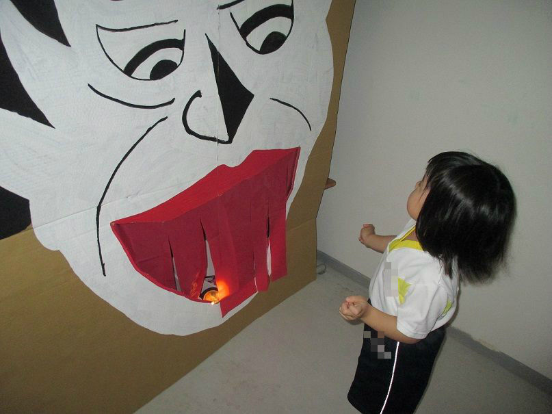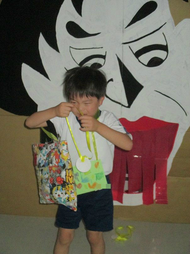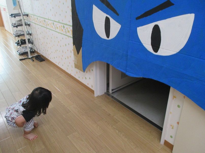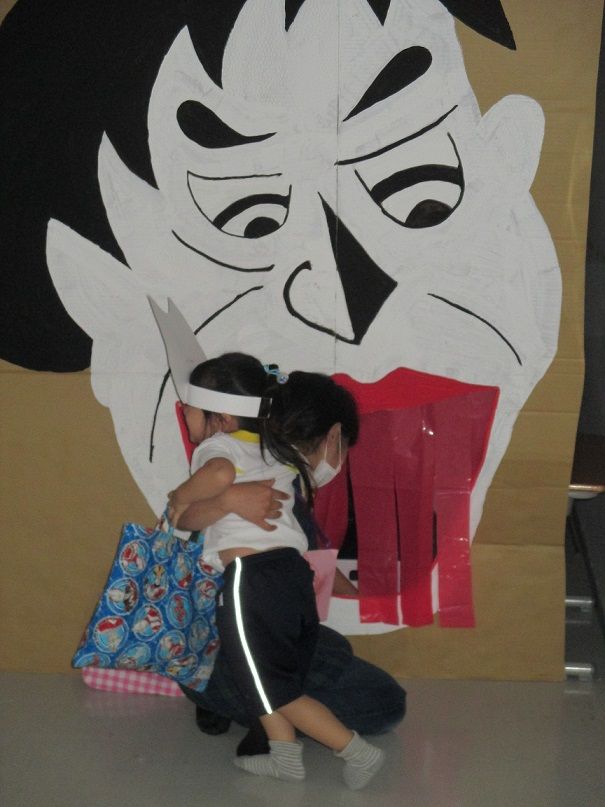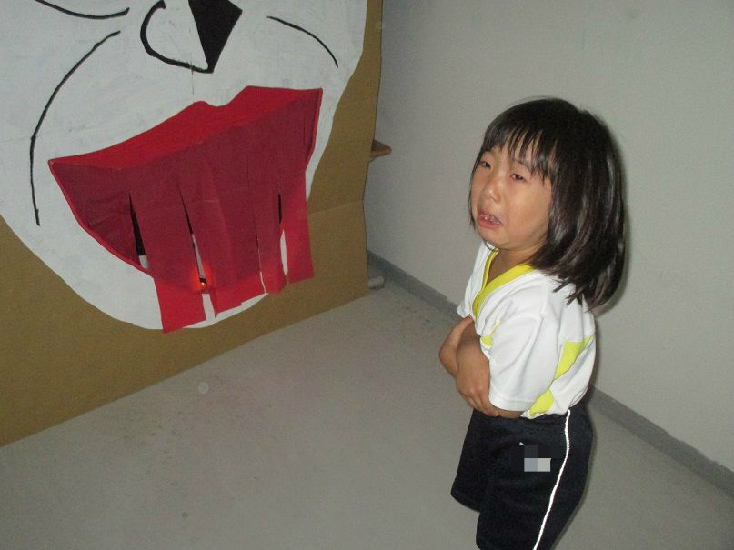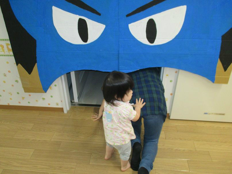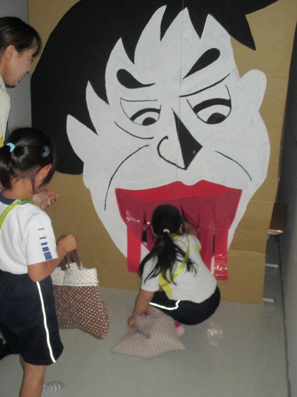 オバケに扮し、入ってきたお友達を脅かす以上児クラスのお友達もノリノリです![]()