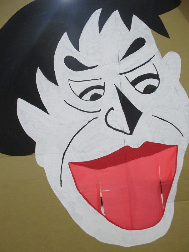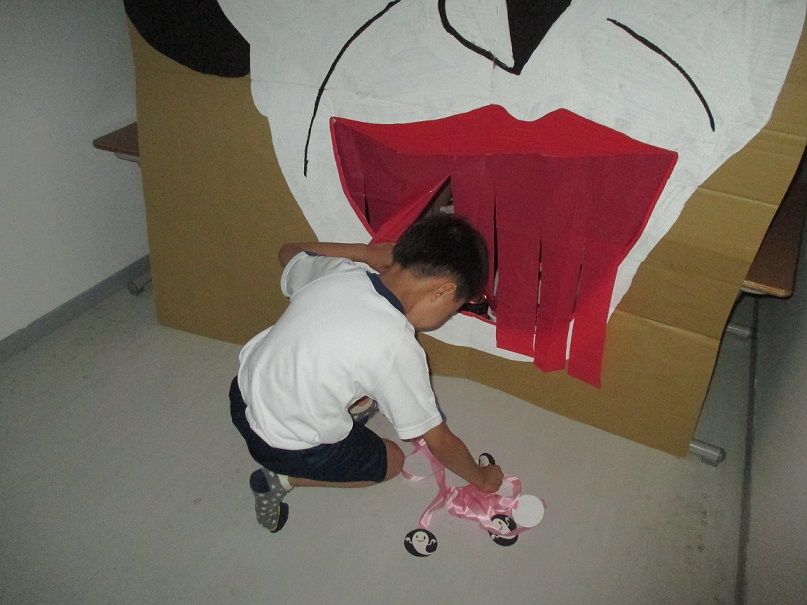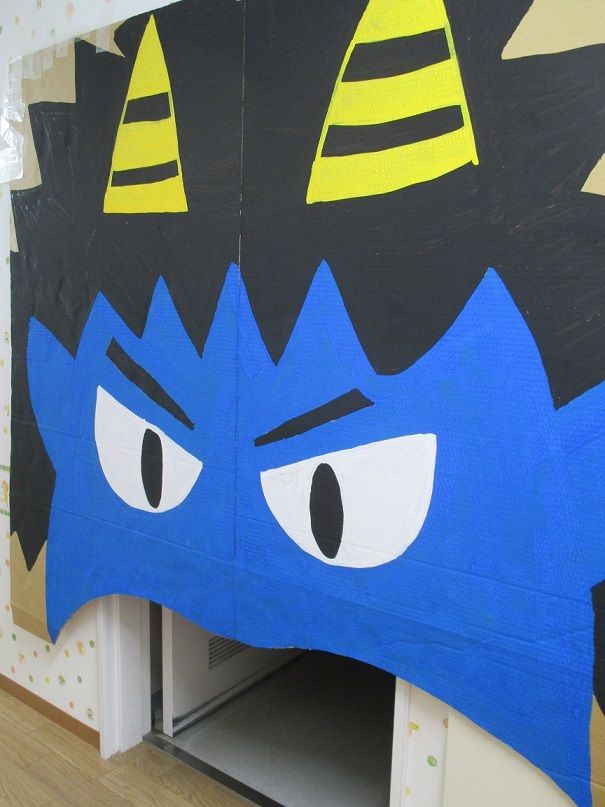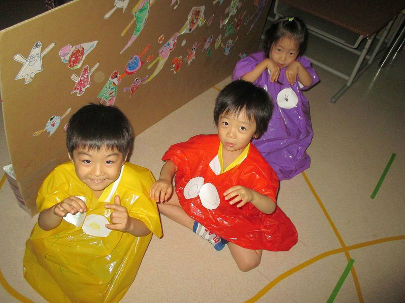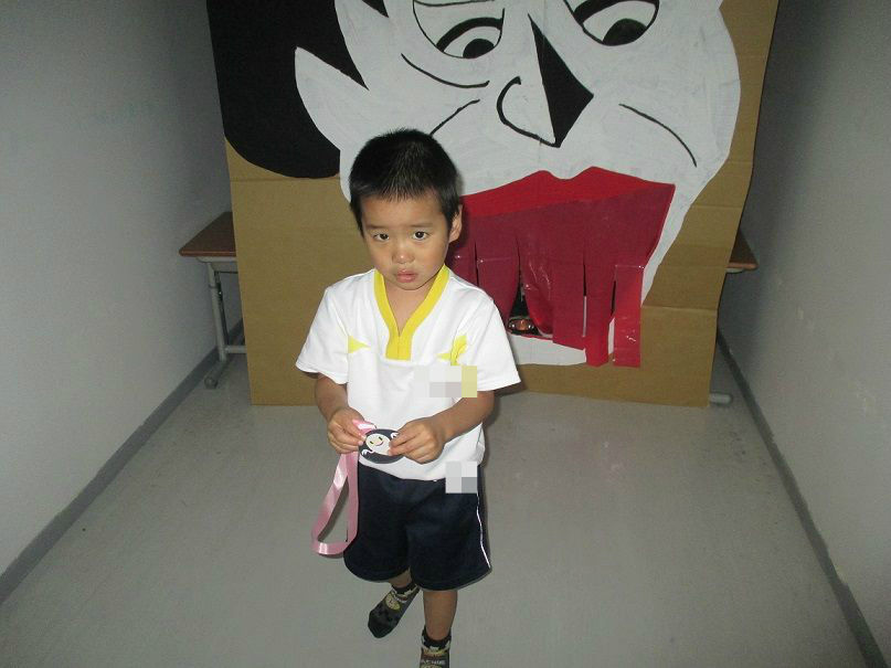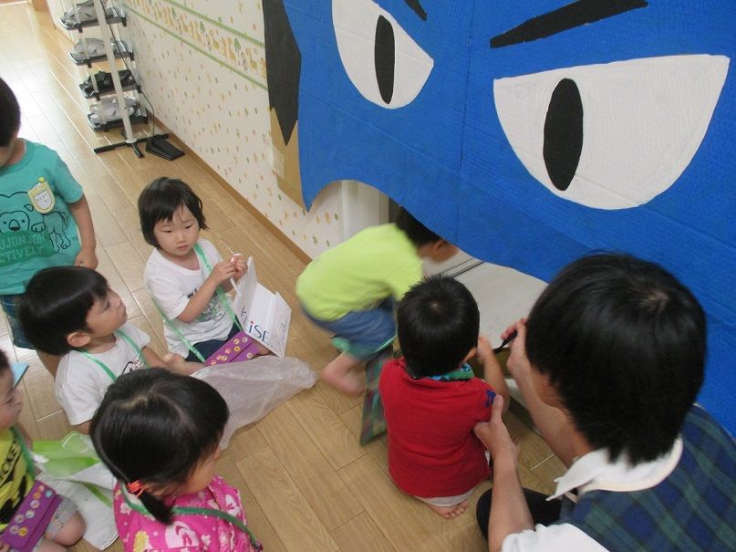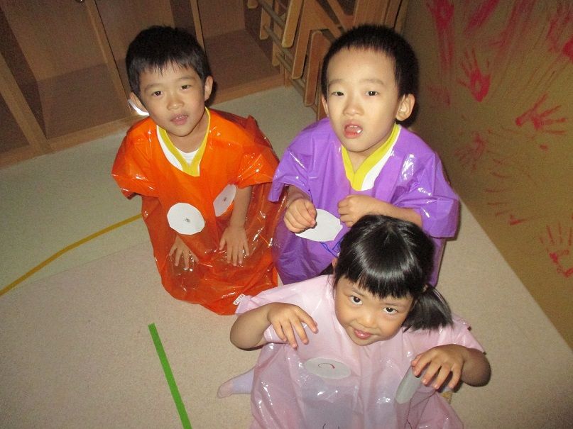 オバケに扮し、入ってきたお友達を脅かす以上児クラスのお友達もノリノリです![]()