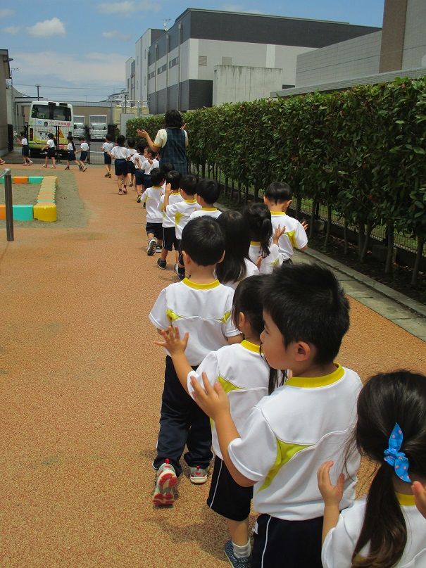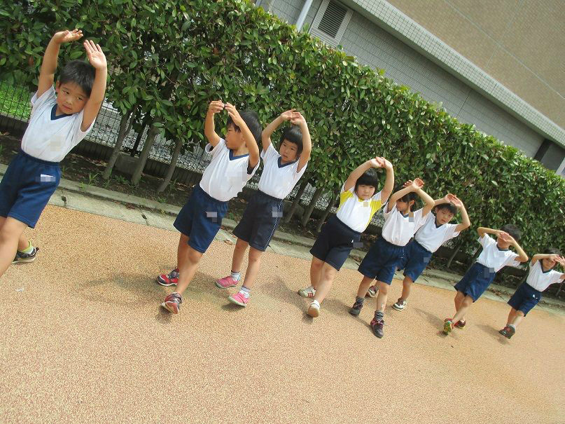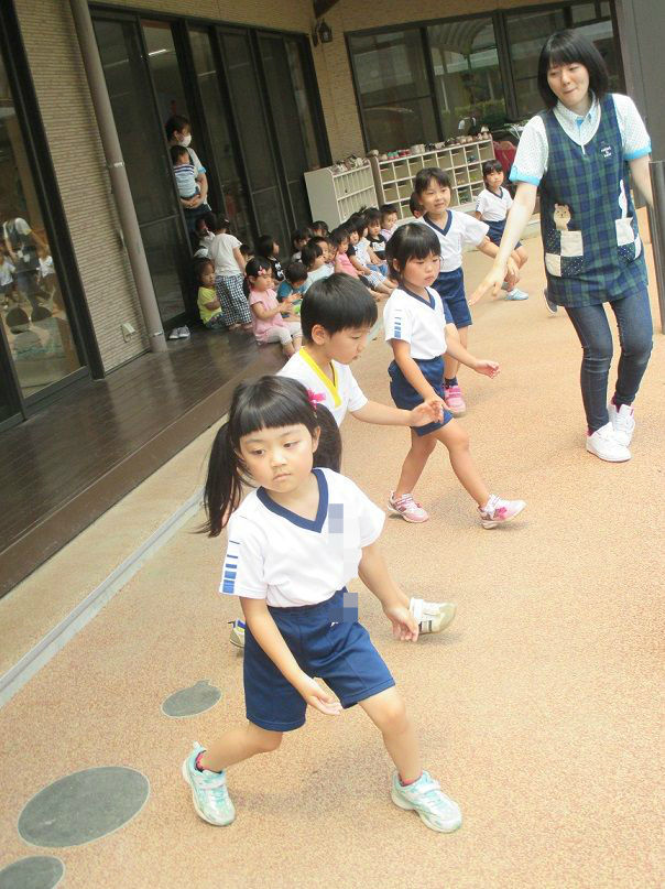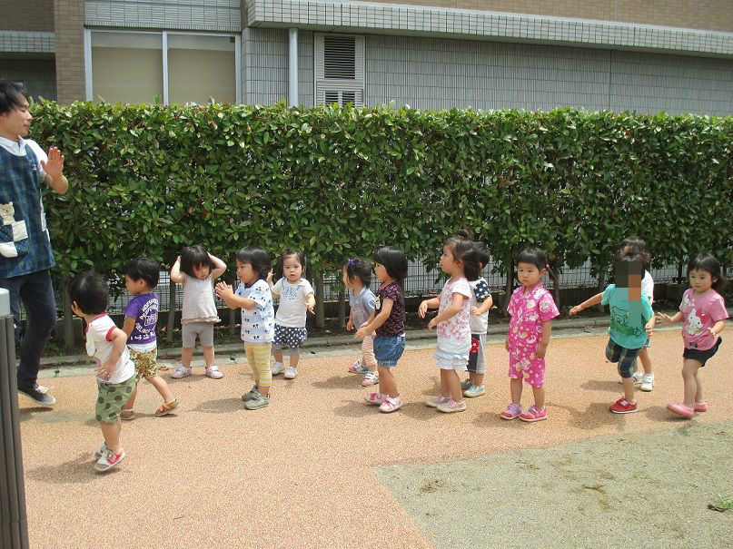 園内夏祭り④ 2016年07月21日 各お店をまわり終ったら、盆踊り 外は気持ちのいい青空快晴 園庭に出て、みんなで円になり準備 今年は、ポケモン音頭・アラレちゃん音頭の2つを踊りました 未満児クラスのお友達も先生の動きをマネしながら楽しく踊りました 曲に合わせて、動きもバッチリ 1歳児クラスのお友達は、ウッドデッキから手拍子で応援してくれました