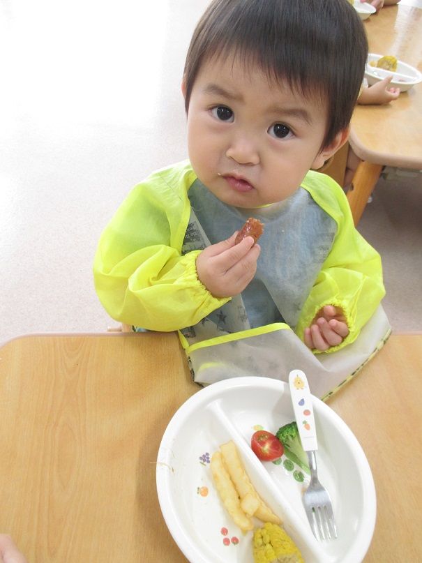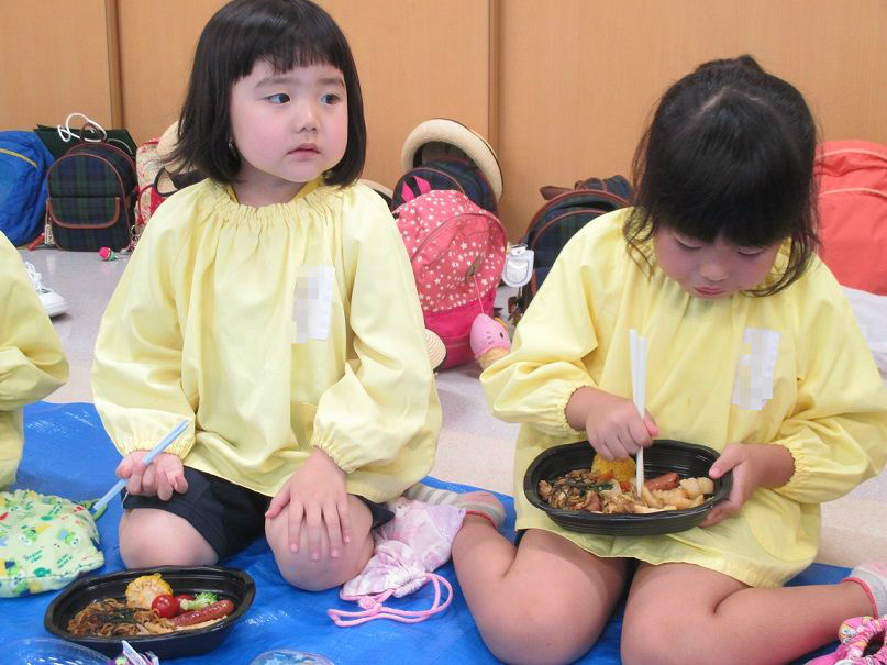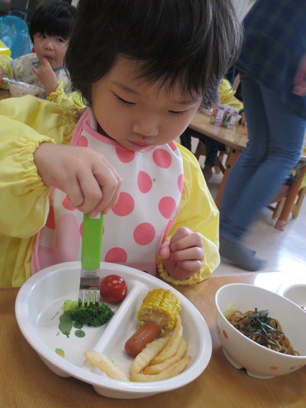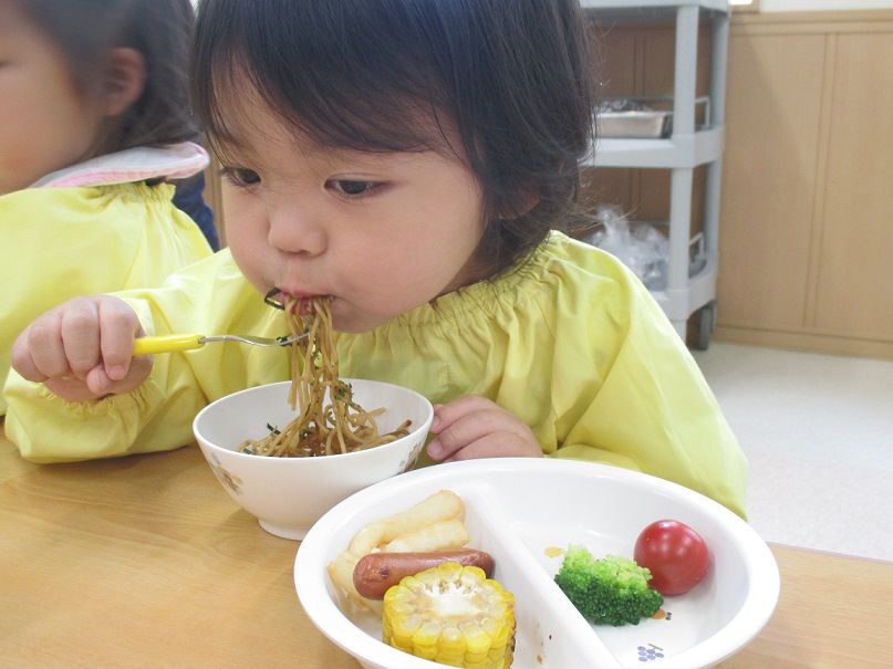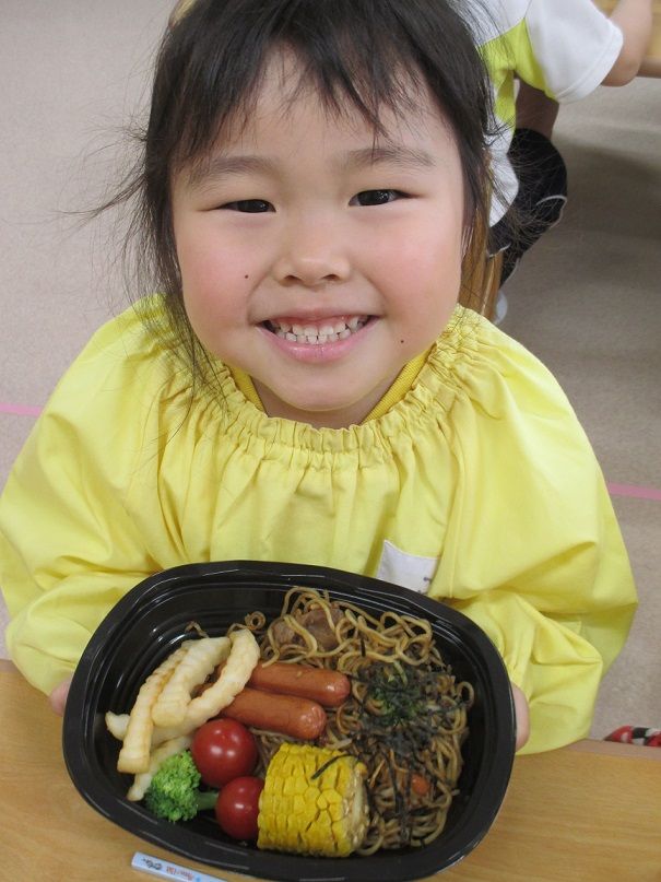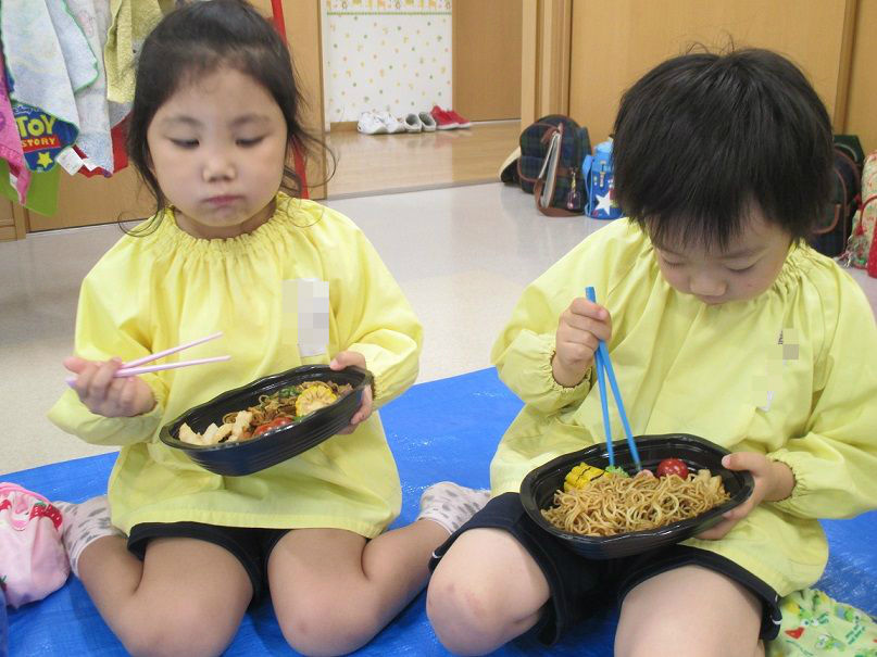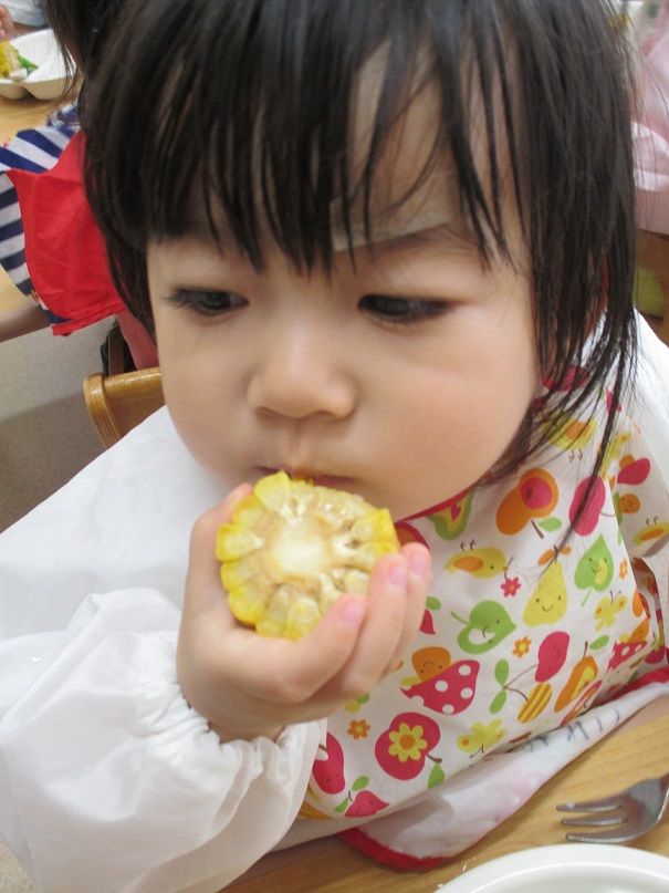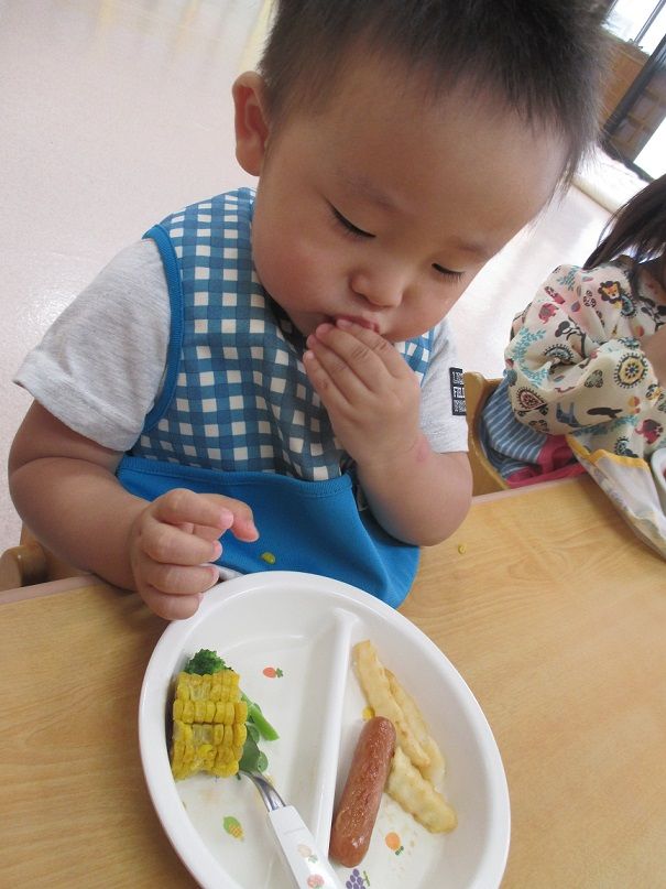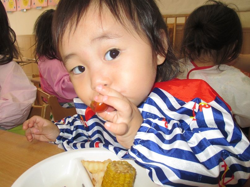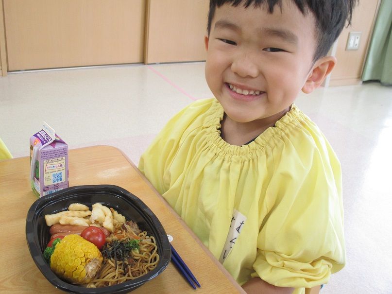 園内夏祭り⑤ 2016年07月21日 次は、待ちに待ったお昼の時間 この日の給食は夏祭りメニューやきそばやきとうもろこしポテトウインナーブロッコリー・トマトぶどうジュース盛りだくさんで、おいしそう~ 4~5歳クラスは、ホールにてみんなで食べました ちょっぴり特別なメニューにみんなも笑顔が止まりません 未満児クラスのお友だちも、夢中で頬張っていました いつにも増して、美味しいお昼の時間でした