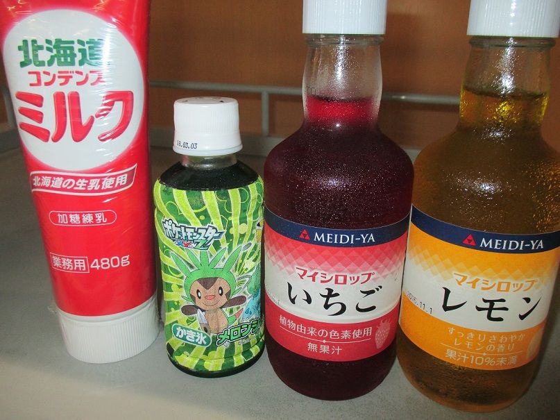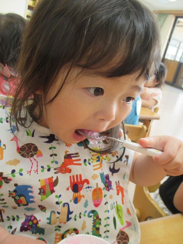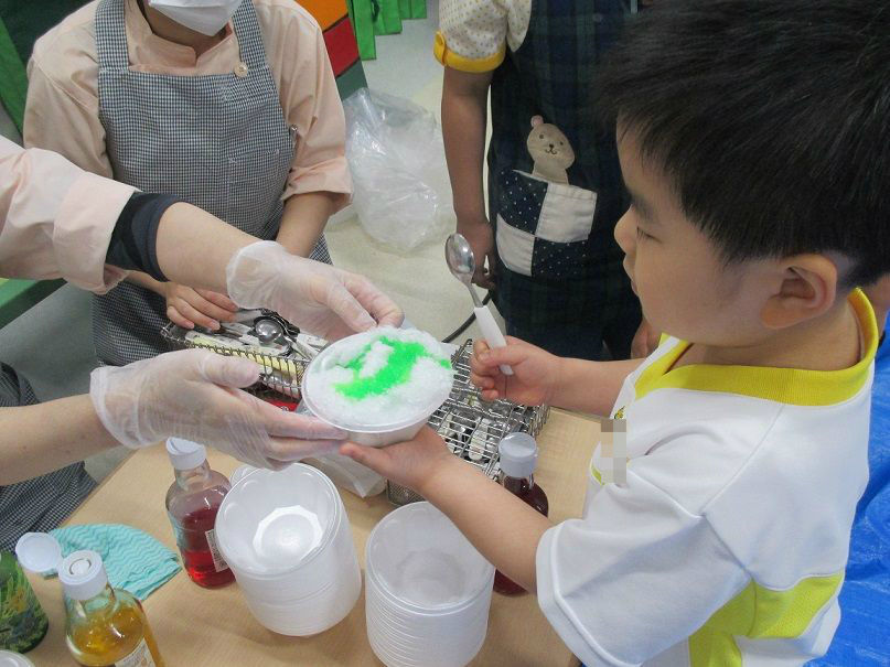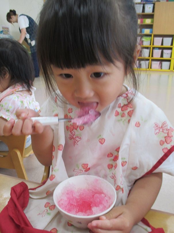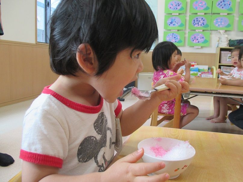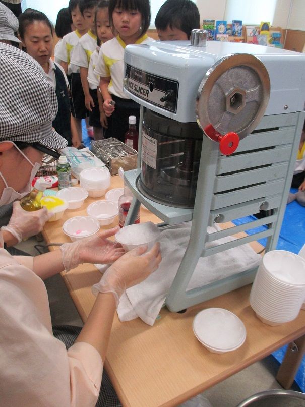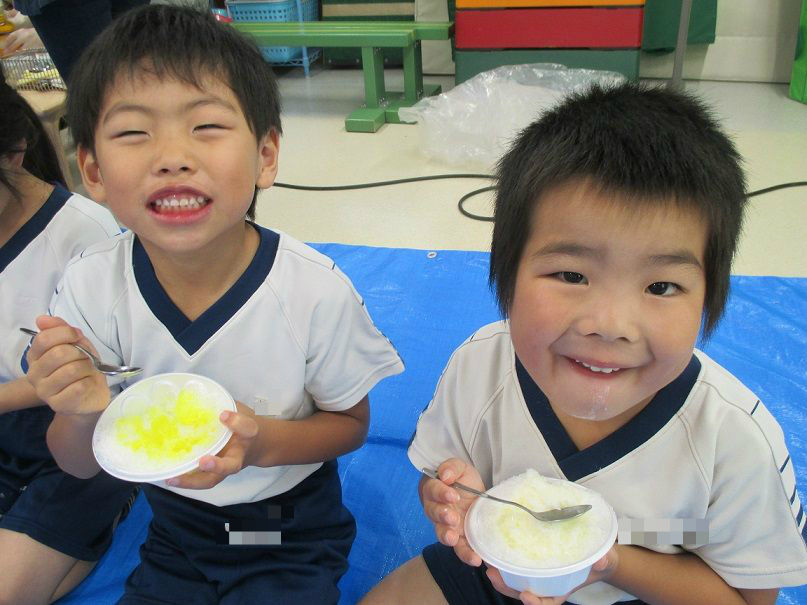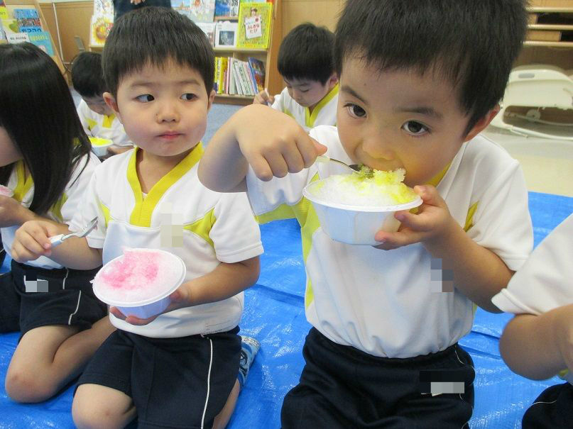 園内夏祭り⑥ 2016年07月21日 長~い記事になってしまいましたが、園内夏祭りの記事はこれが最後になります 午後のおやつは、給食の先生方に、カキ氷をつくってもらいました 味は…いちご・れもん・めろん・練乳から好きなものを選びましたどれも魅力的で、悩んじゃいますね 順番に並び、出来立てのおいしいカキ氷をもらいました 暑い日だったので、冷たいカキ氷がとてもおいしく感じたようです 楽しかった・ちょっぴり怖かったなど…いろんな思いを抱いた園内夏祭り『毎日お祭りだといいのにな』という声もありました どんなお祭りだったのか、子どもたちからのお話しもよく聞いてみて下さいね