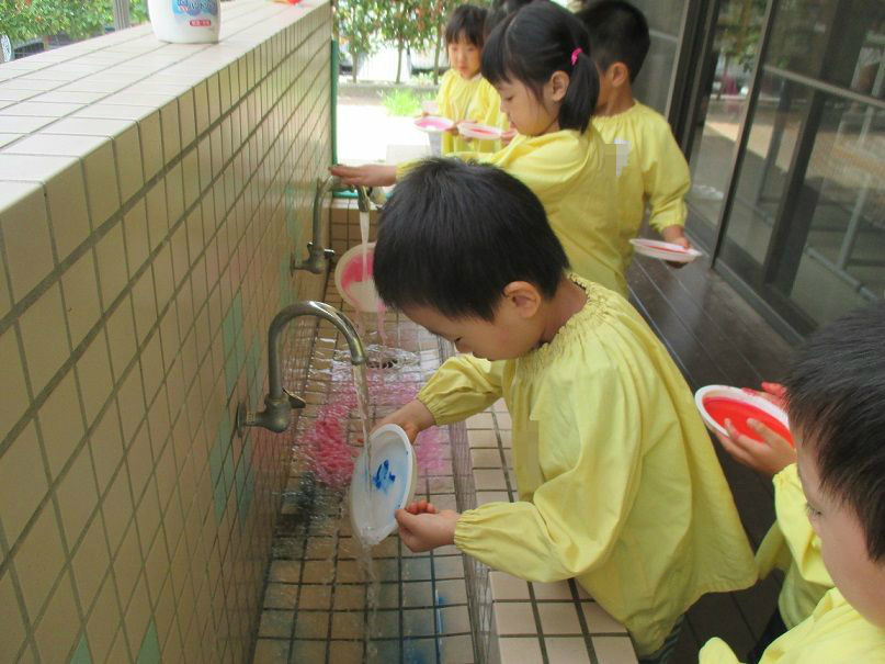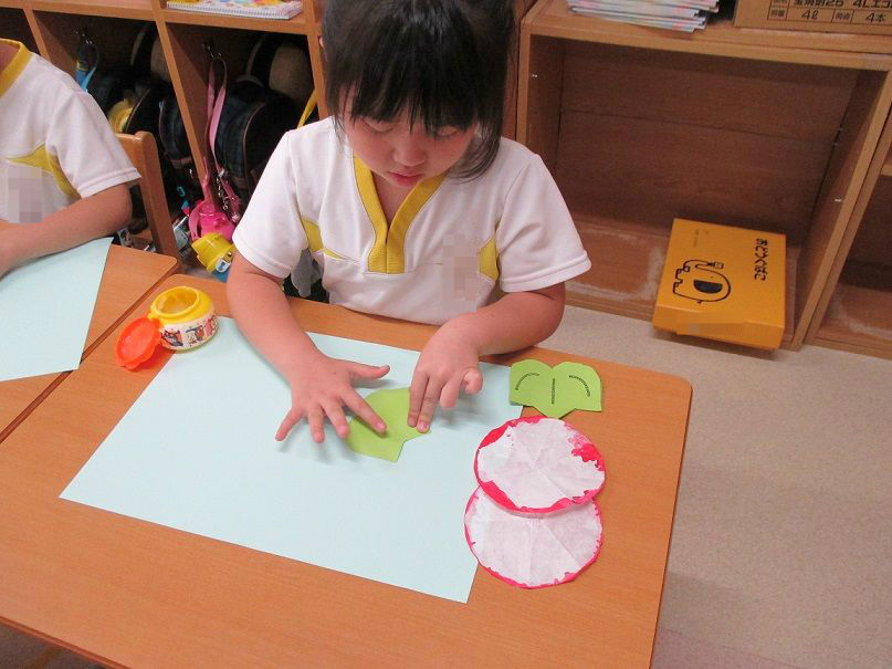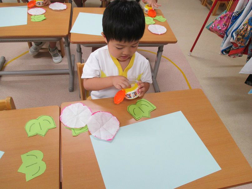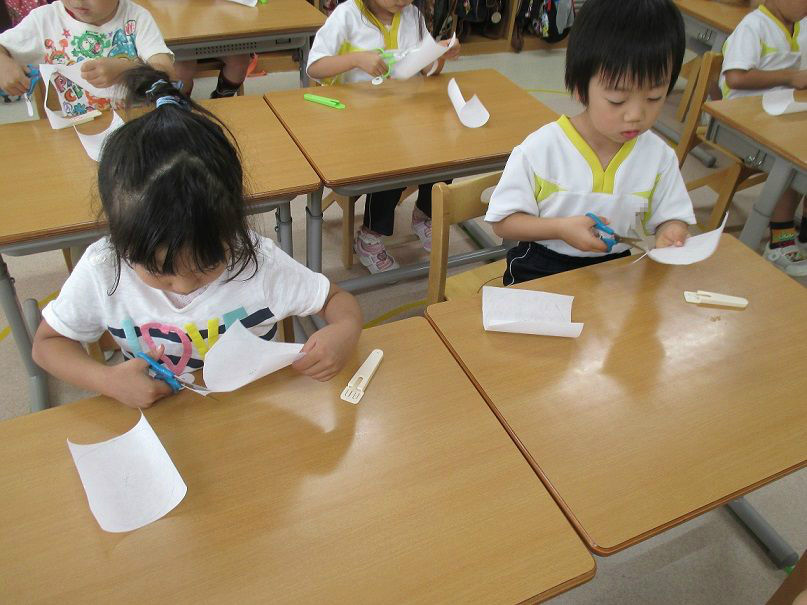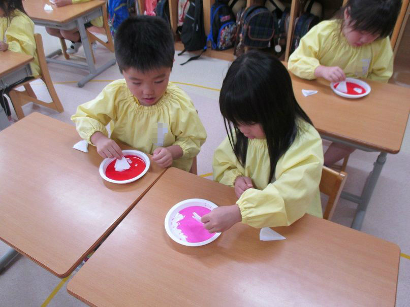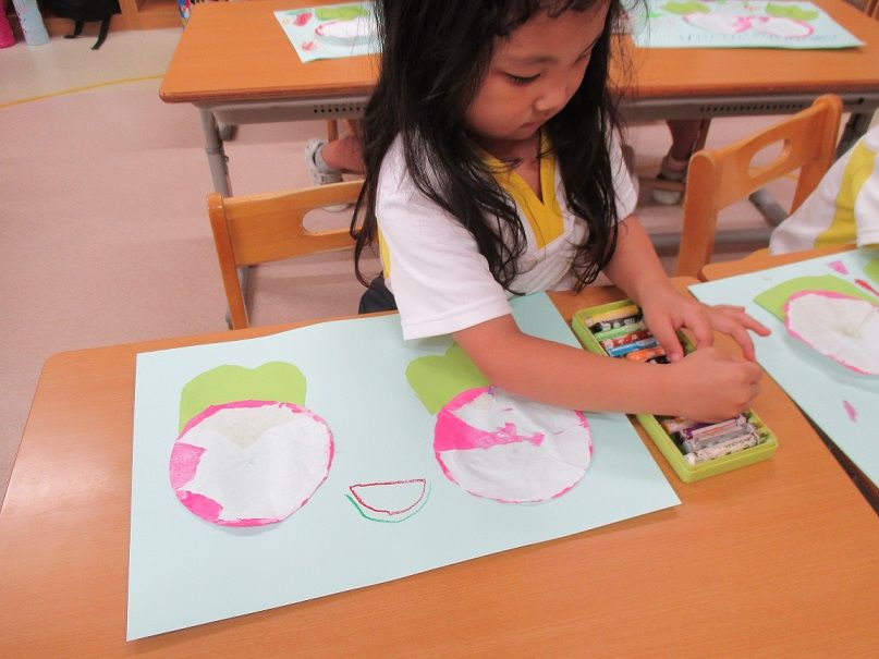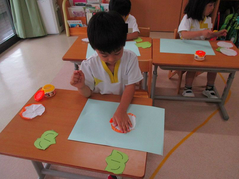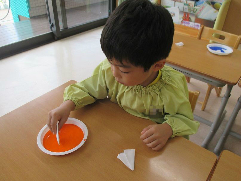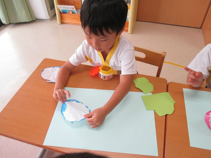 🌼あさがお製作🌼 2016年08月08日 ばなな組で、あさがお製作を行いました 障子紙を丸く切り、半分折りを2~3回します その後、自分の好きな色の絵の具を水で薄め、その中に折った障子紙のフチを浸し、色を付けました 全部浸らないように“チョンチョン”と… 続いて、あさがおの葉作り線に沿って、切っていきます みんな、真剣な眼差し それぞれの箇所を作り終ったら、貼り合わせ バランスを見ながら、自分たちで調整して貼っていました 最後にあさがおの周りに絵を描きました 夏の季節に合わせ、これはスイカかな… ピカピカ太陽マークを描いて、あさがおの成長を願っているのかな 完成した作品は、クラスに掲示されますので、ご覧になって下さい 製作後もきちんと自分たちでお片付けもしました