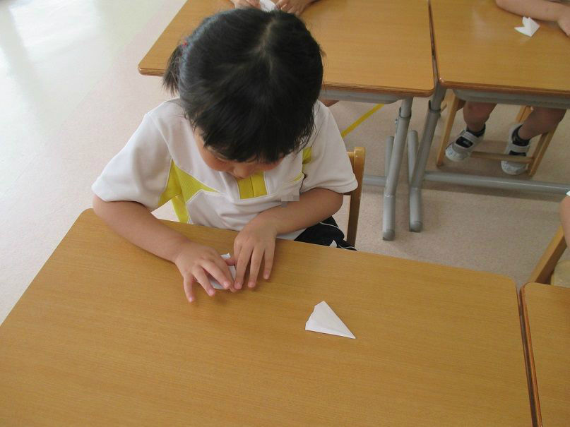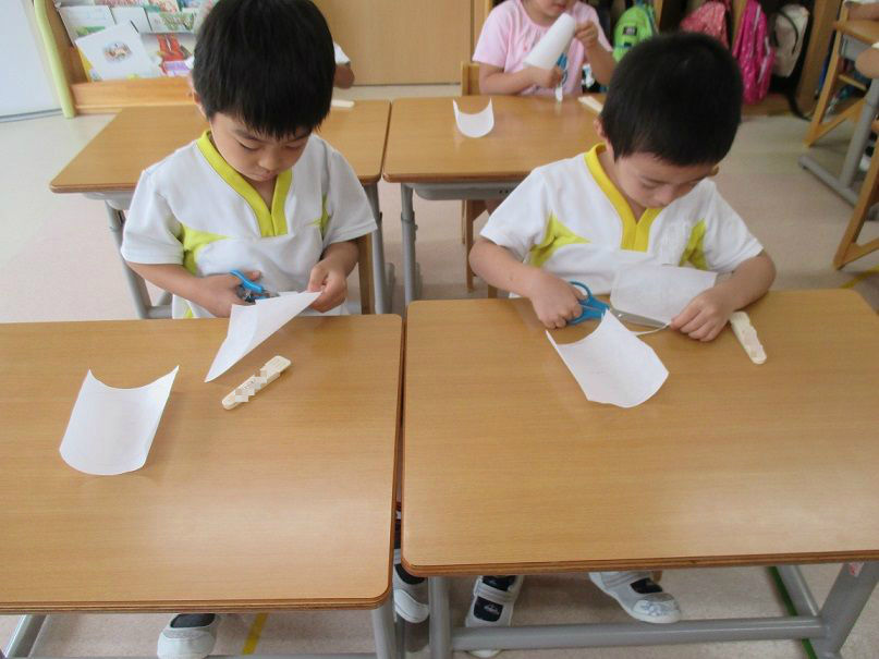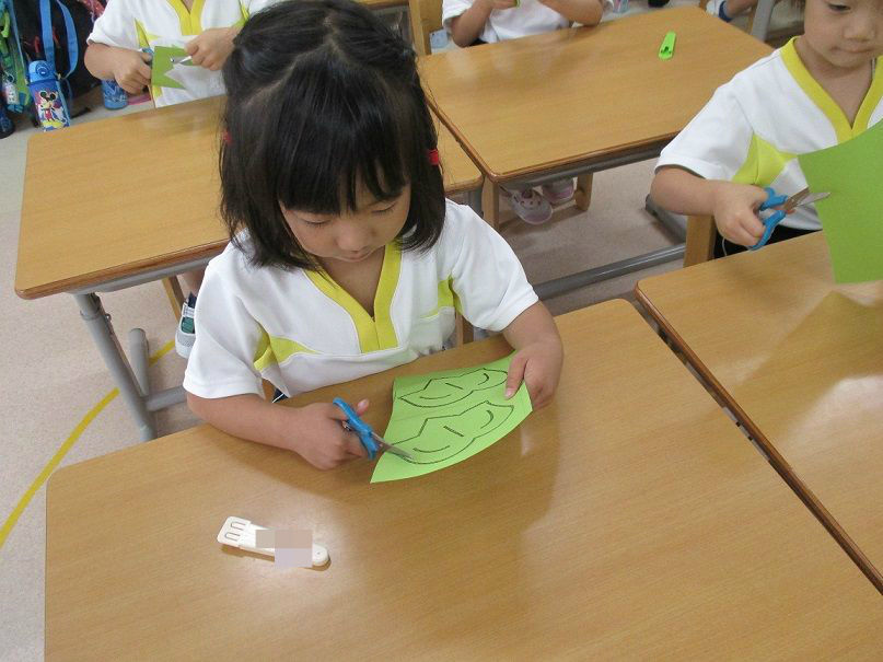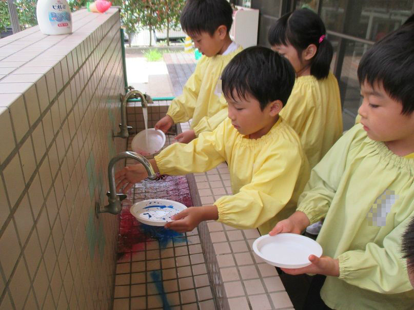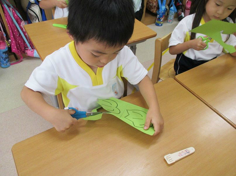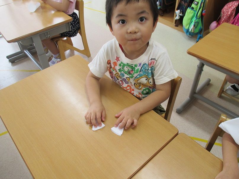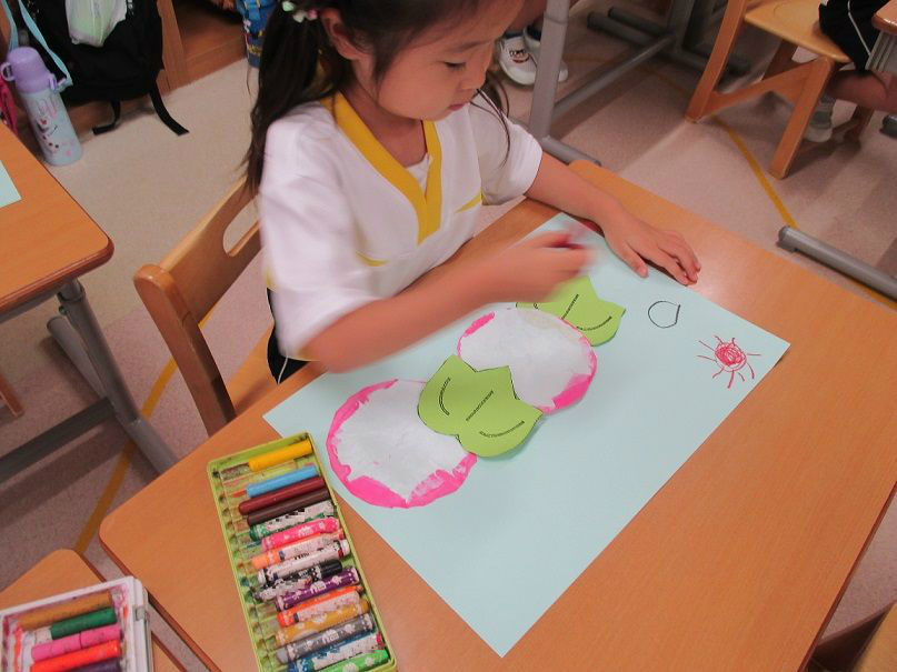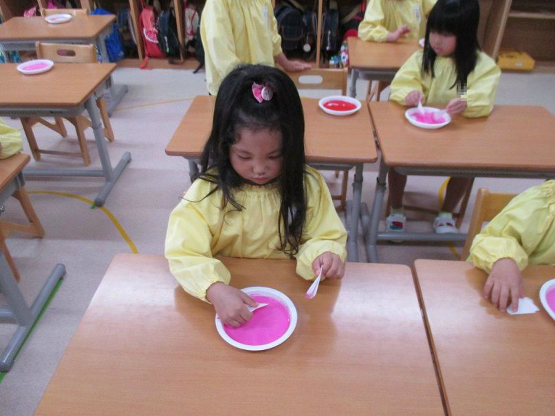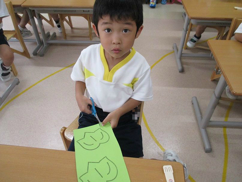 🌼あさがお製作🌼 2016年08月08日 ばなな組で、あさがお製作を行いました 障子紙を丸く切り、半分折りを2~3回します その後、自分の好きな色の絵の具を水で薄め、その中に折った障子紙のフチを浸し、色を付けました 全部浸らないように“チョンチョン”と… 続いて、あさがおの葉作り線に沿って、切っていきます みんな、真剣な眼差し それぞれの箇所を作り終ったら、貼り合わせ バランスを見ながら、自分たちで調整して貼っていました 最後にあさがおの周りに絵を描きました 夏の季節に合わせ、これはスイカかな… ピカピカ太陽マークを描いて、あさがおの成長を願っているのかな 完成した作品は、クラスに掲示されますので、ご覧になって下さい 製作後もきちんと自分たちでお片付けもしました