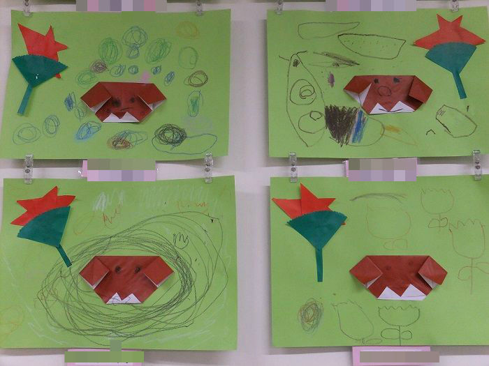 角と角を合わせたり、折り目をきちんと付けたりと、やる事がたくさんで、子ども達も一生懸命でした![]()