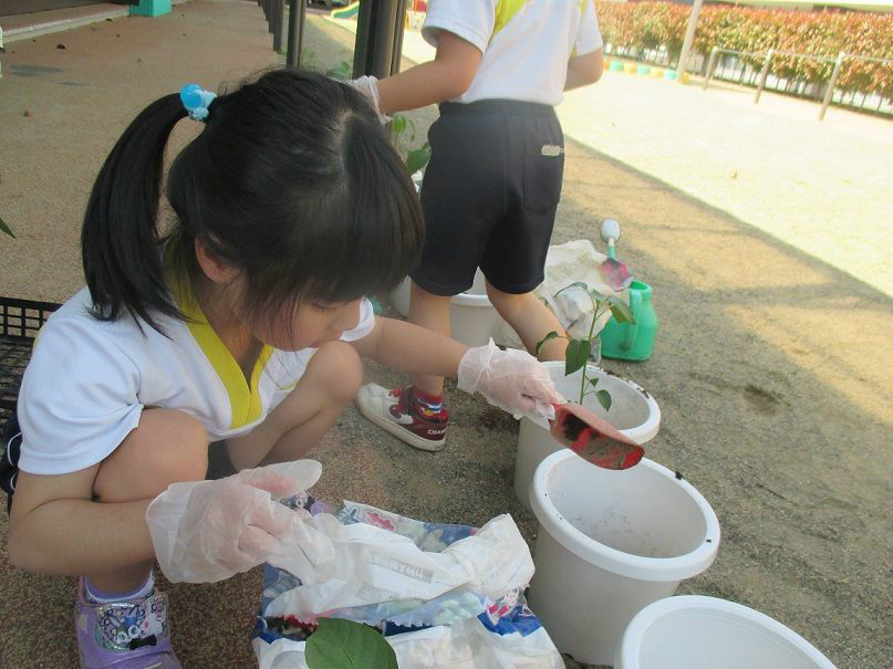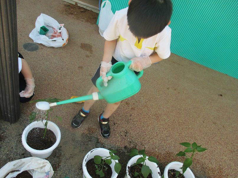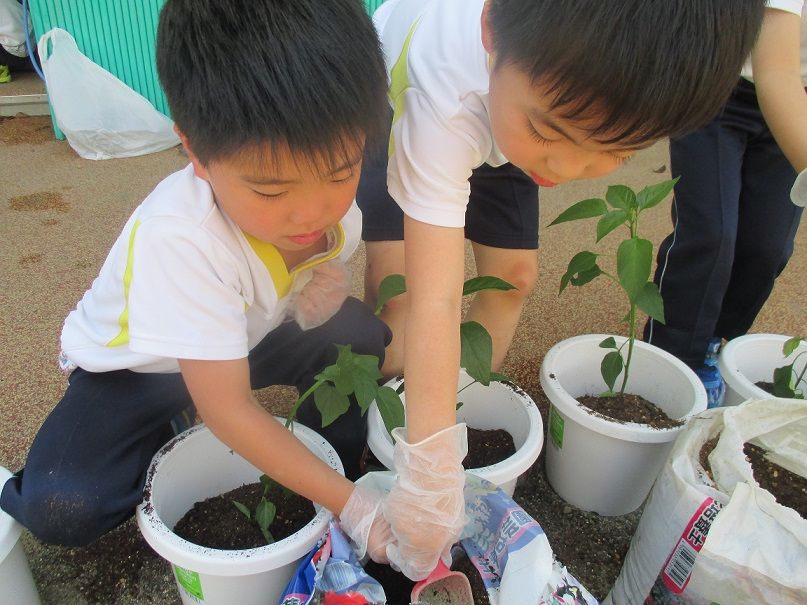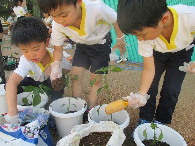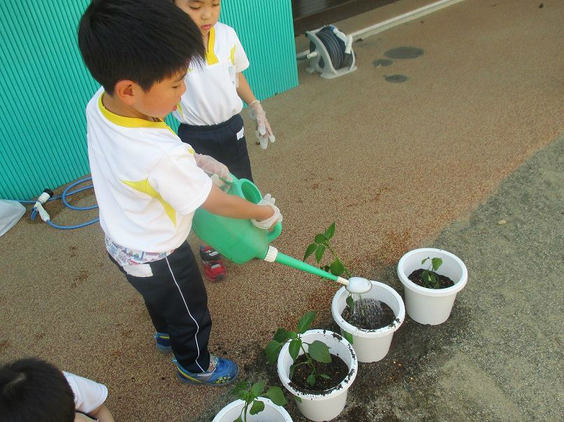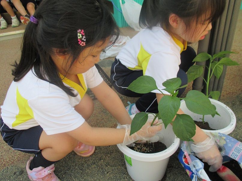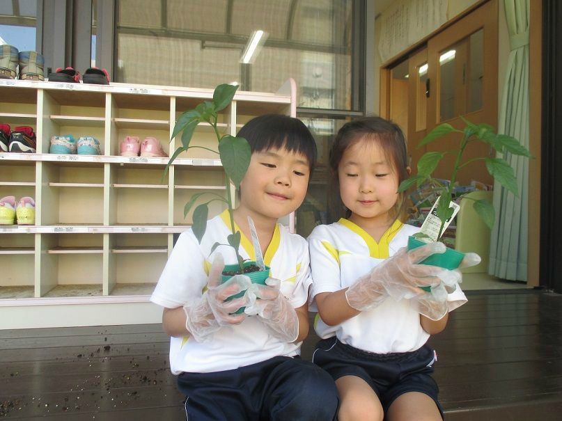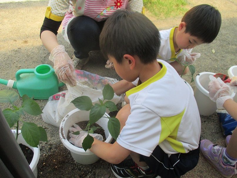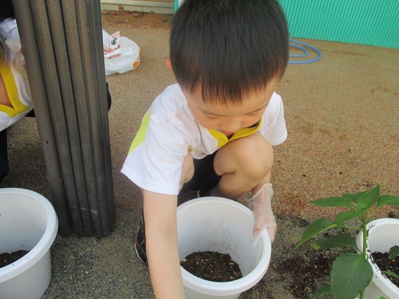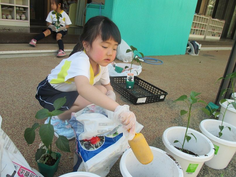 苗植え♪ 2017年05月26日 先日、れもん組のみんなで、野菜を植えました その野菜とは、ピーマンですピーマンと言っても、子どもピーマンと言って、苦味を抑えたものになります少しでも、みんなが野菜を好きになってくれるようにと願いを込めて、ピーマンにしてみました先生の愛情が、みんなに伝わってくれますように・・・ それでは、様子をお伝えします始めに、好きな苗を自分で選びました みんな好みの苗を選ぶことが出来ました その次は、順番に鉢に植えていく作業です 土をスコップですくい、入れていきます 『このくらい?』と、確認しながら入れています みんな真剣そのものです 頑張って 『よいしょ、よいしょ』 十分に土を入れたら、苗を植え、土を周りに入れていきます なかなか思ったところに置けず、苦戦中 最後に、じょうろで水をあげます 丁寧に水をあげていますね じょうずに植えることが、出来ました これから、絵日記をつけて、生長をみんなで見守りたいと思います水やりも、楽しみにしているそうです おおきくなーれ