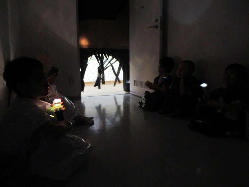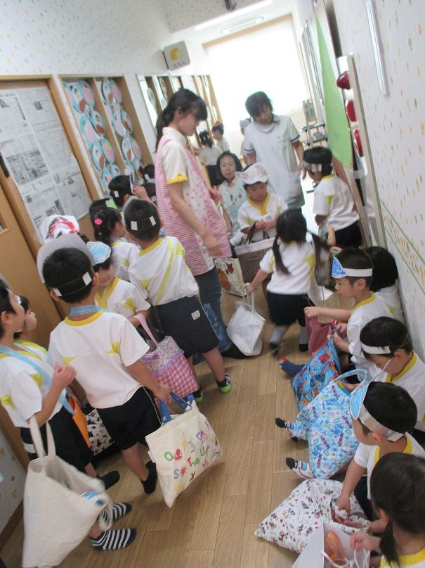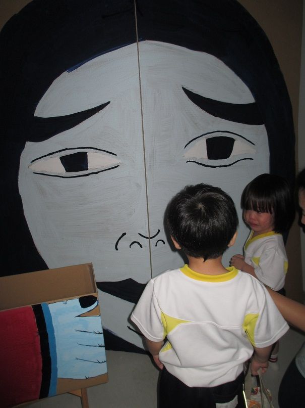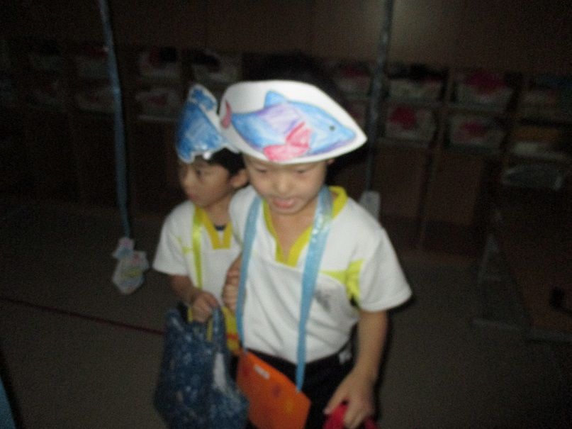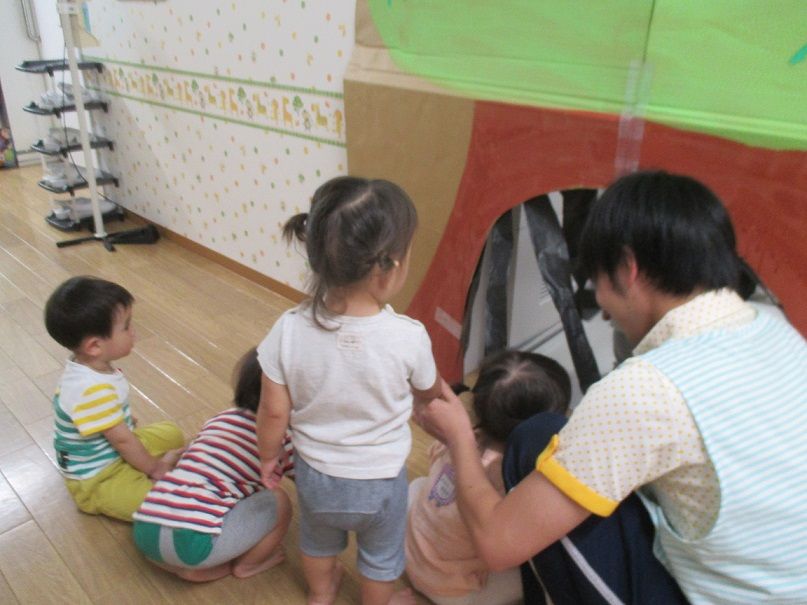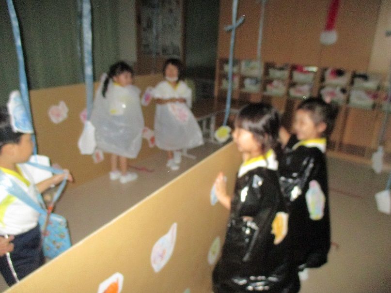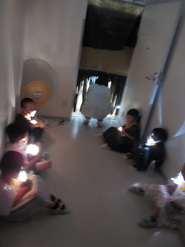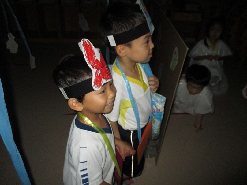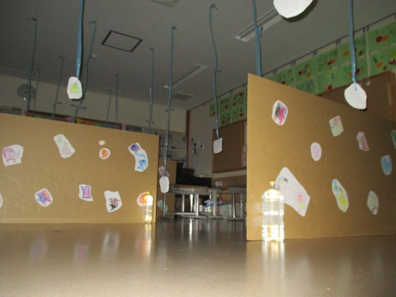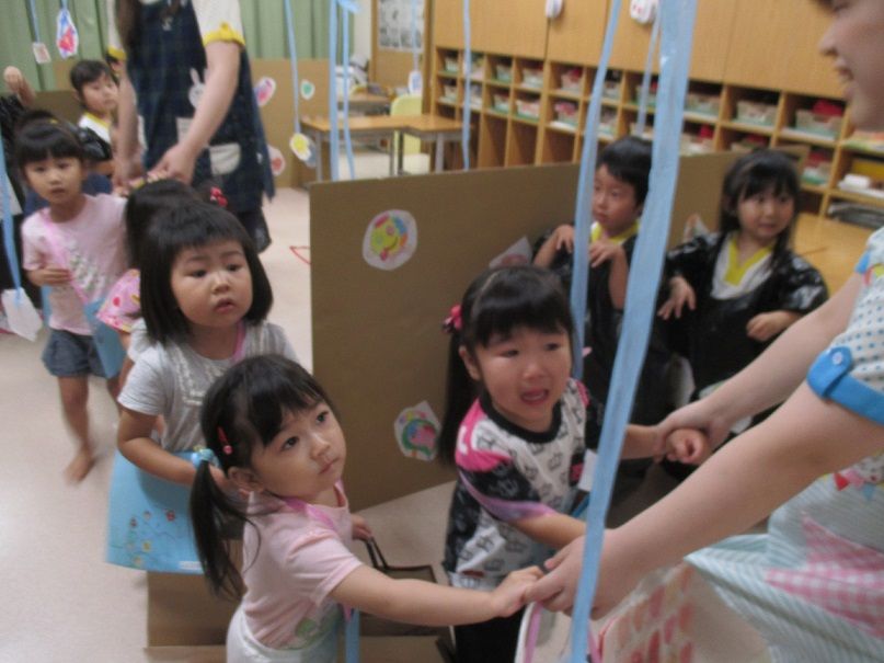 本当は、電気を消した中を進むのですが、未満児クラスは明るいまま![]()