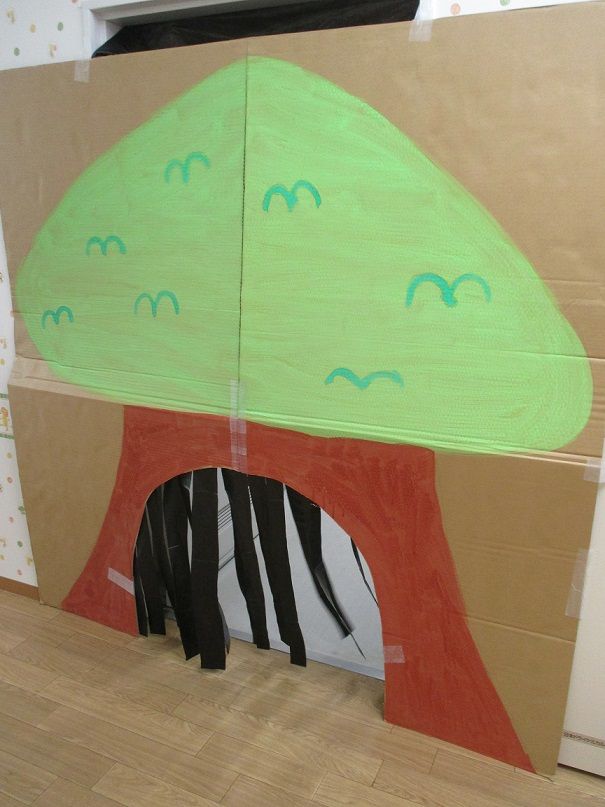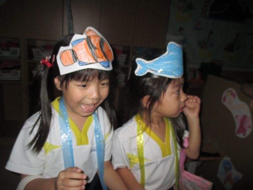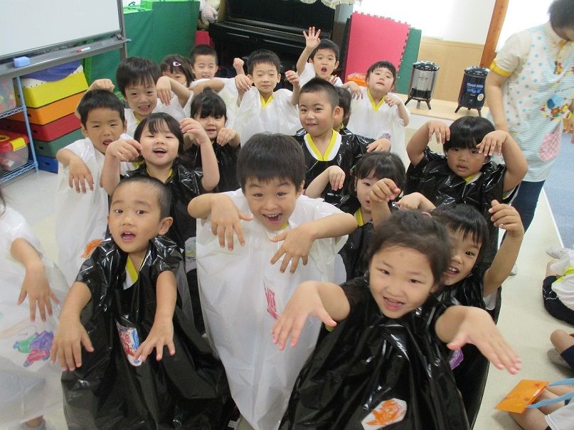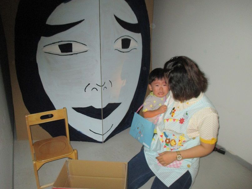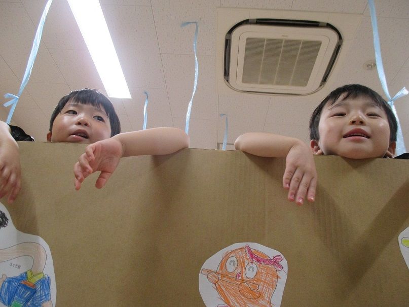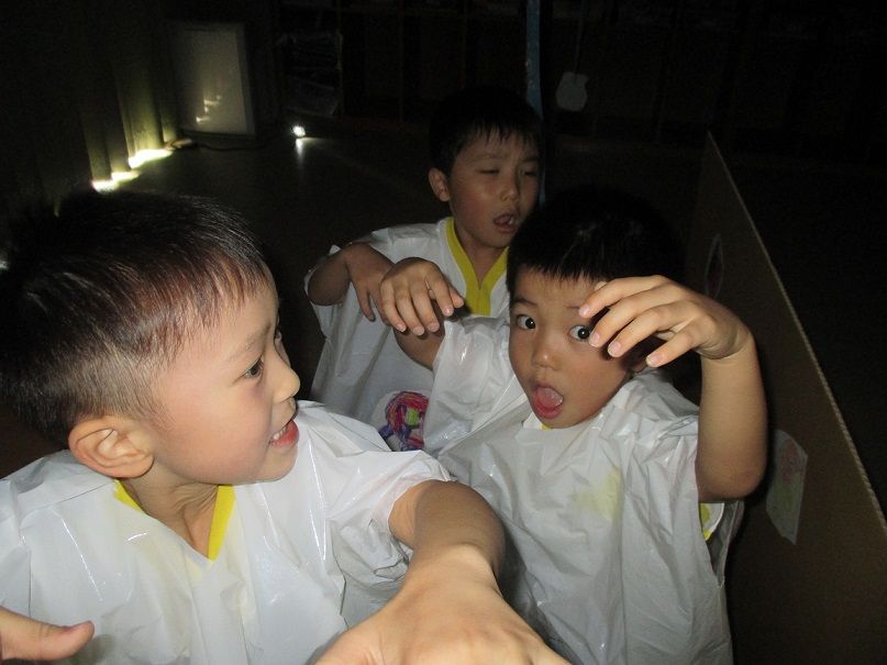 お化け屋敷は、ばなな組・れもん組のお友達が作ったうえに、オバケになってみんなを脅かしました![]()