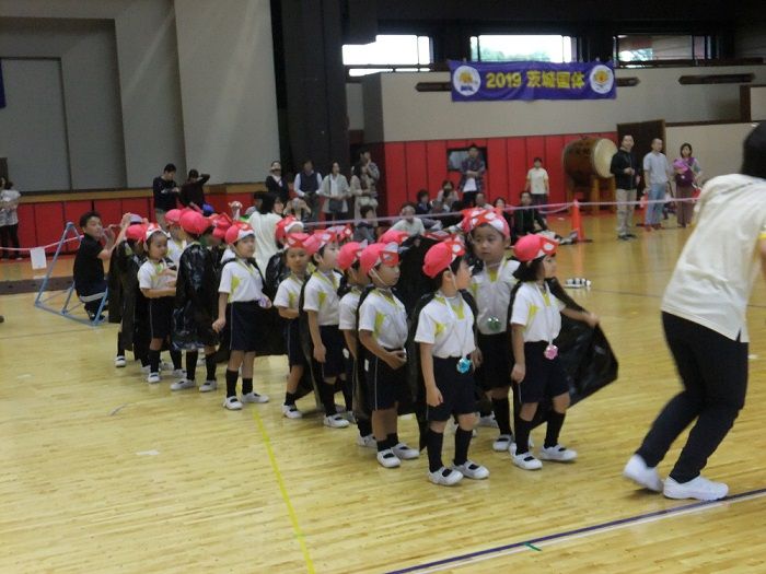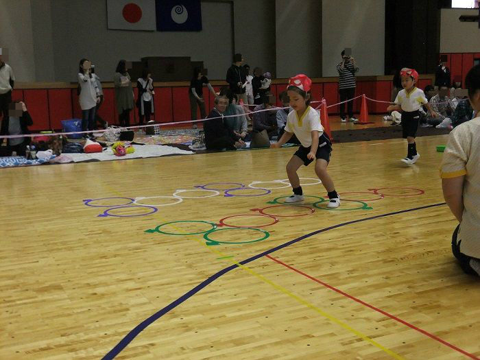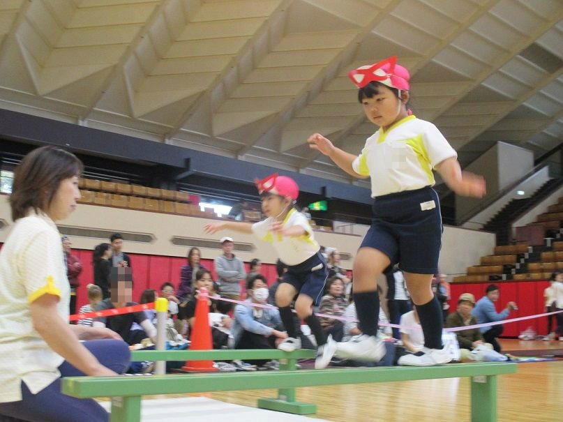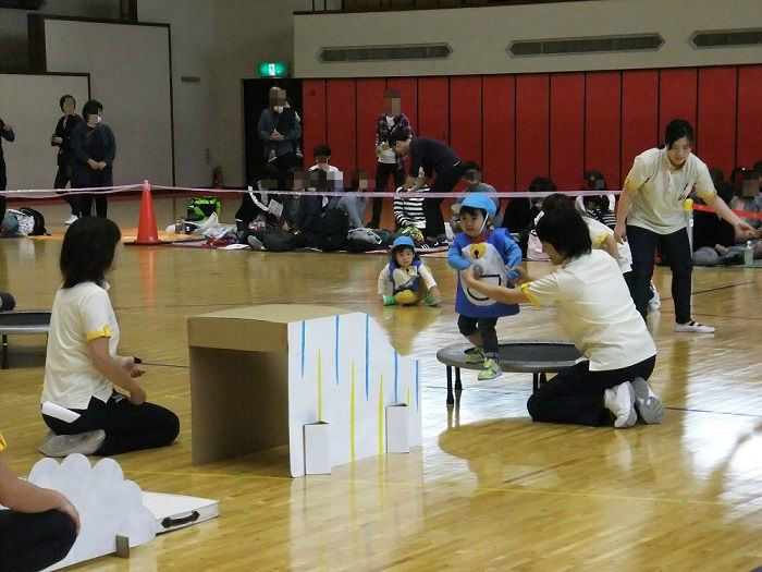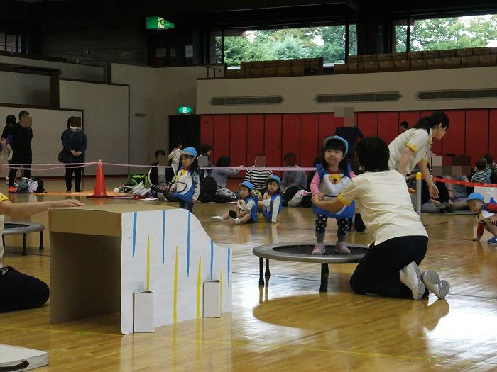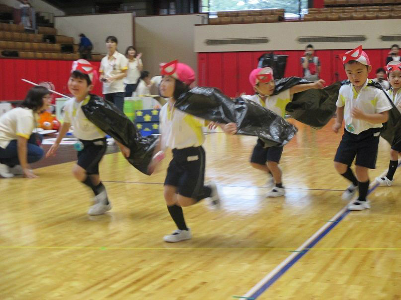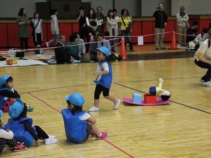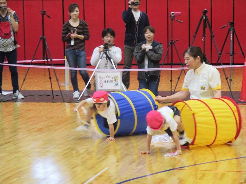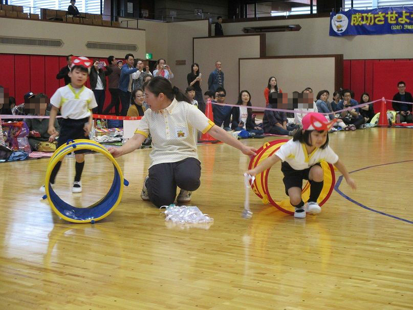 ★運動会②★ 2017年10月24日 ②ぶどう組個人競技 【ドラえもん~のび太君を救え~】 競技名の通り、子ども達の格好はドラえもん入場と同時に『わぁ~』と、みなさんの喜んでいる声が聞こえ、子ども達も少々恥じらう姿が 初めての個人競技でしたが、それぞれ堂々と取り組んでいました トランポリンも、先生と手を繋いでやるので安心 障害物を乗り越えて、最後はのび太君を連れてゴール ③ばなな組個人競技 【怪盗バナーナからの挑戦状】 運動会会場に届けられた挑戦状『本日、スワン保育園の運動会にお宝を頂きに参上する』 なんだってぇぇ——-Σ(゚д゚;) そんなこんなしているうちに、怪盗バナ~ナ達が現れた お宝目指して、勢いよくダッシュ どんどん現れる障害物も、何のその 困難にぶち当たっても、負けないぞ~ このトンネル内で、見事お宝をGET 任務を果たしたバナ~ナ達は、また次のお宝をいただきに、姿をくらましたのであった