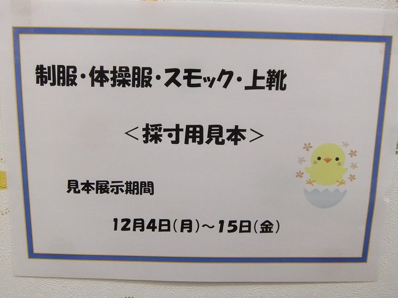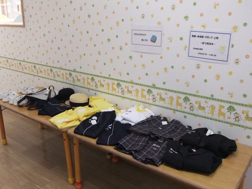 ☆お知らせ☆ 2017年12月08日 今年度も、残り3ヶ月となりました 少しづつ進級準備が始まっています 只今、ぶどう組からりんご組へと進級にあたり、制服等の採寸をしていただいています 夏服用・冬服用の制服や体操服、スモック、上靴、鞄など… 今の体にサイズにピッタリにしたり、成長する事を考慮したサイズにしたりと、みなさん悩みに悩んでいるようです 12月4日(月)~15日(金)まで掲示しています 使用したら、次の人の為に、キレイに畳んで下さいますようお願いします