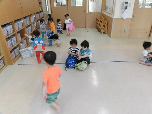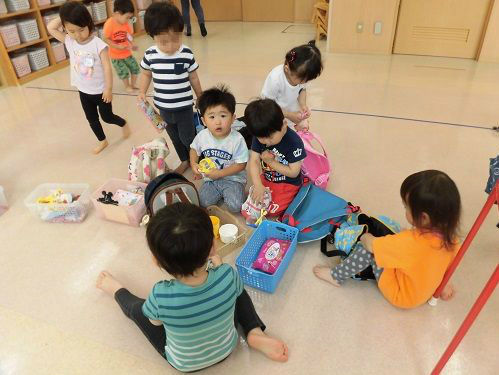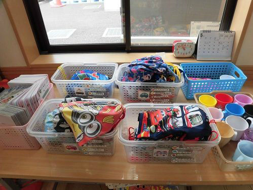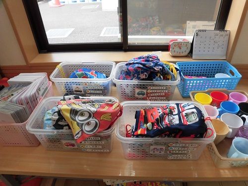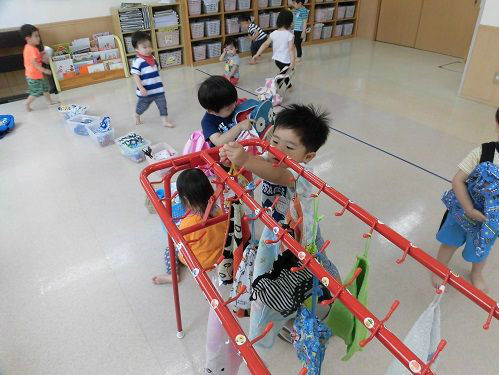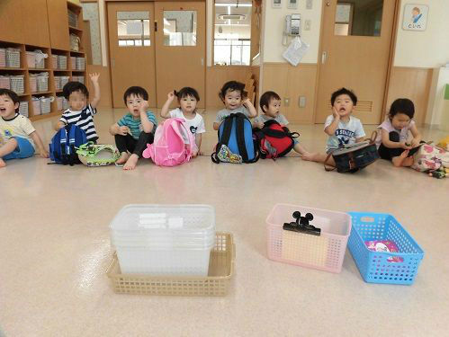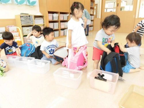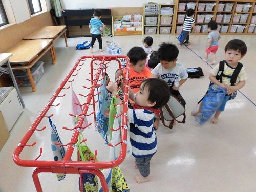 朝の支度頑張ってます! 2018年06月19日 ぶどう組に進級し、朝の仕度を自分たちでするようになりましたまずはリュックをカゴから出します みんな準備できたかな「はーい」 それぞれ自分の荷物を出して決められたところに移します 巾着だって開けられます タオルかけも上手ですね みんなとっても上手にできました