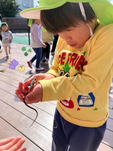 カナヘビを見つけました!子どもたちは興味津々♬そっと近づいて観察したり、触ってみたり、「怖くないよ!」と、頭の上にのせてみたりしました!!