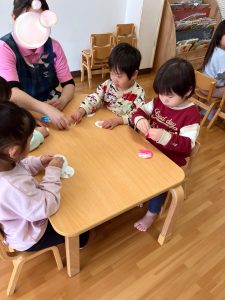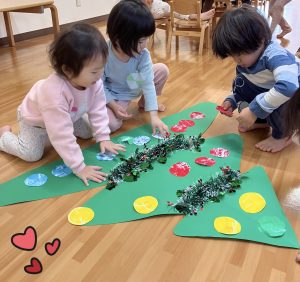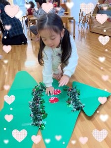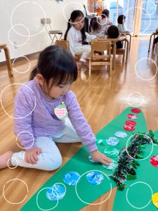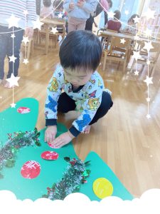 にじみ絵で描いた飾りをクリスマスツリーに貼りました!!両面テープを一生懸命剥がし、「ここにしようかな~」「いっぱいはりたい!」と考えながら貼る姿が見られました♪完成したツリーを見て笑顔で眺めたり、お友達と見比べたりしながらクリスマスの雰囲気を楽しんでいました☆