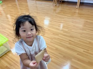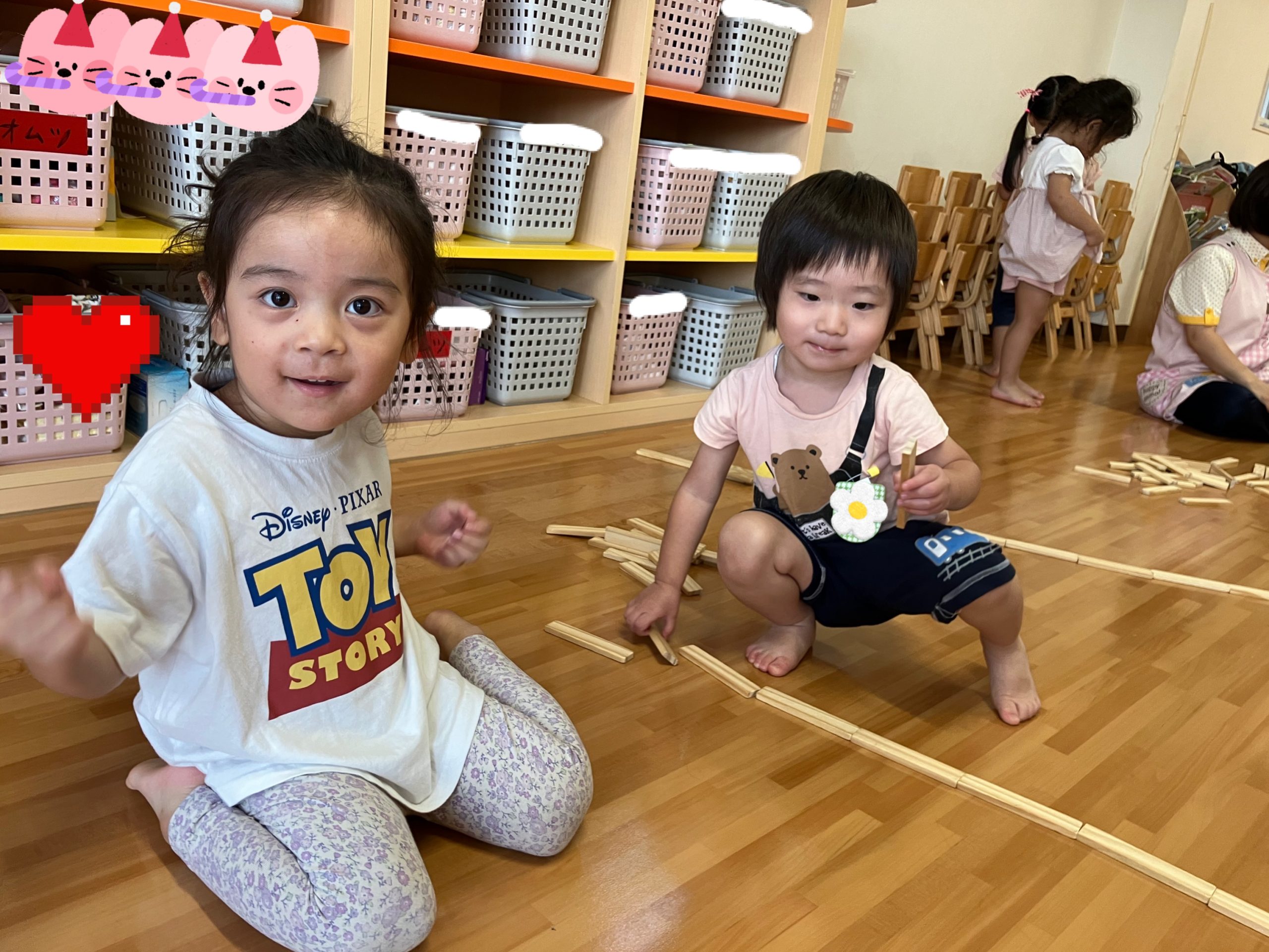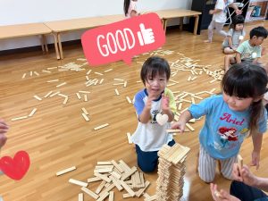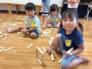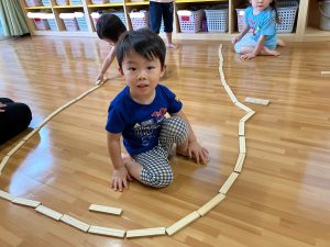 かるがも組☆室内遊び! 2025年09月27日 こんにちは!かるがも組です! 先日、お部屋でスティッピー(積み木)で遊びました♪並べて線路を作ったり積み重ねたり、お家を作ったりと様々なものに見立てて楽しそうに遊んでいました!!