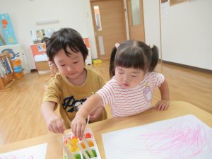 クレヨンでお絵描きをした画用紙に色水を凍らせた氷で塗り絵をしました。