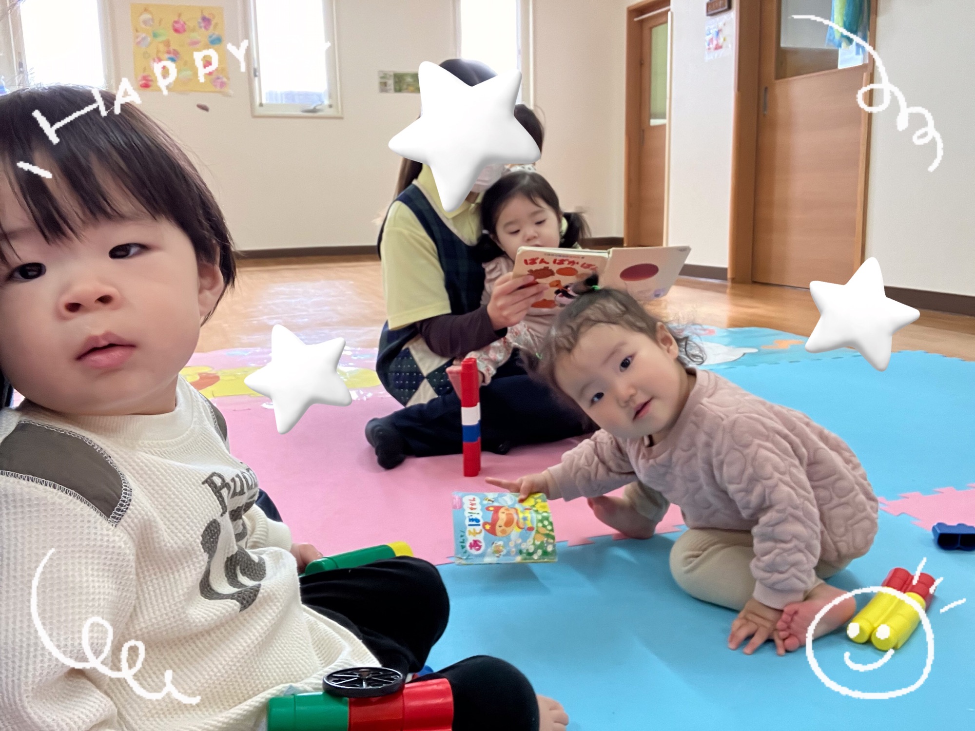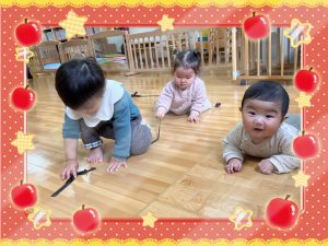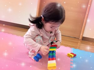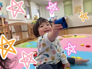 色んなものに興味を持って色んなものに触れてたくさん遊んでもらいたい!と思い、お部屋では、絵本やBブロック、テープ剥がしなど、それぞれ好きな遊びを思い思いに楽しんでいます。