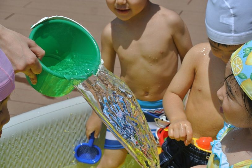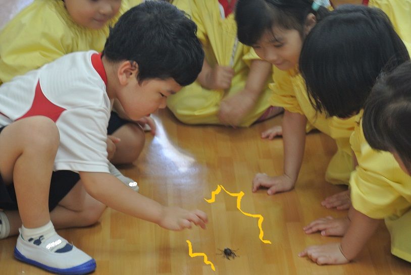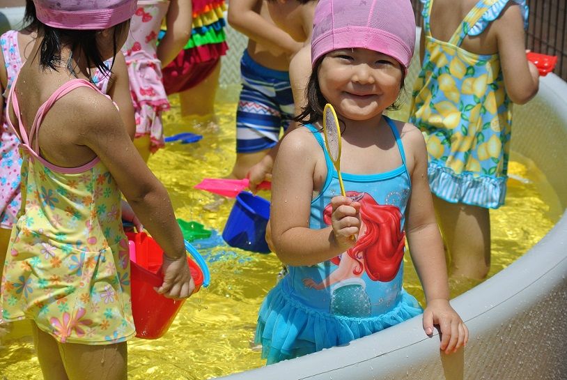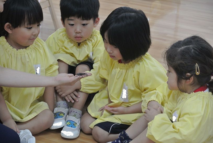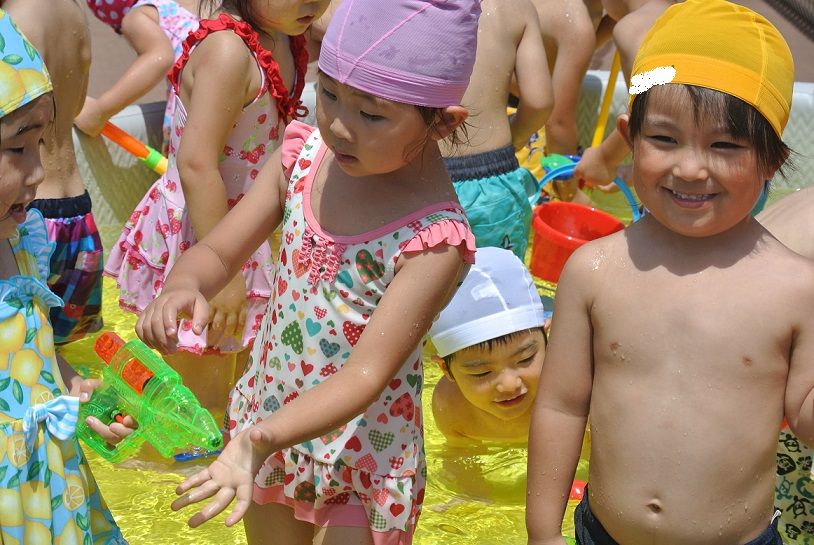 待ちに待った!! プール遊び☆☆ 2015年07月13日 今日は、やっとお天気に恵まれ、 楽しみにしていたプール遊びを行いました たくさんのおもちゃにも、おおよろこびのみんなです きんぎょすくいもあったよ~ とっても気持ちよさそうな あひるぐみさんでした そして・・・ なんと、ひばりぐみさん、かもめぐみさんのお兄さん、お姉さん達が・・・ 「 くわがたをつかまえたよ~ 」 と見せにきてくれました 夏のお友だちにちょぴり、ドキドキ お兄さん、さすがですね とっても楽しい一日でした