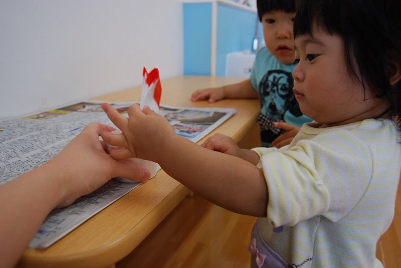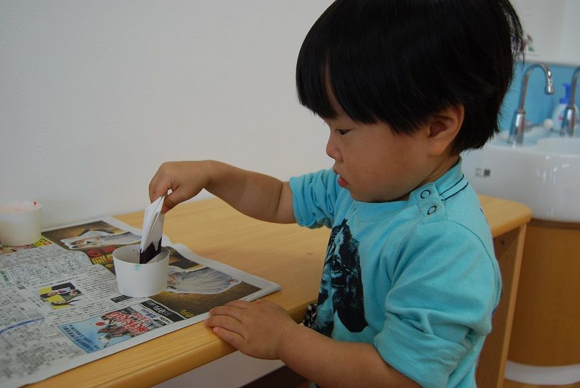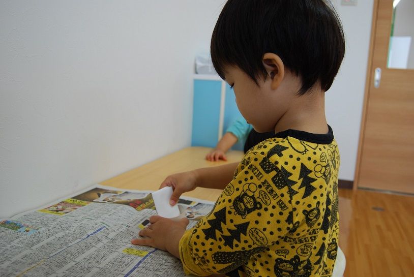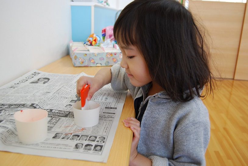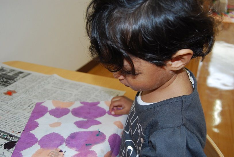 ふくろう組では、障子紙に絵具をつけ、折り染めをしました