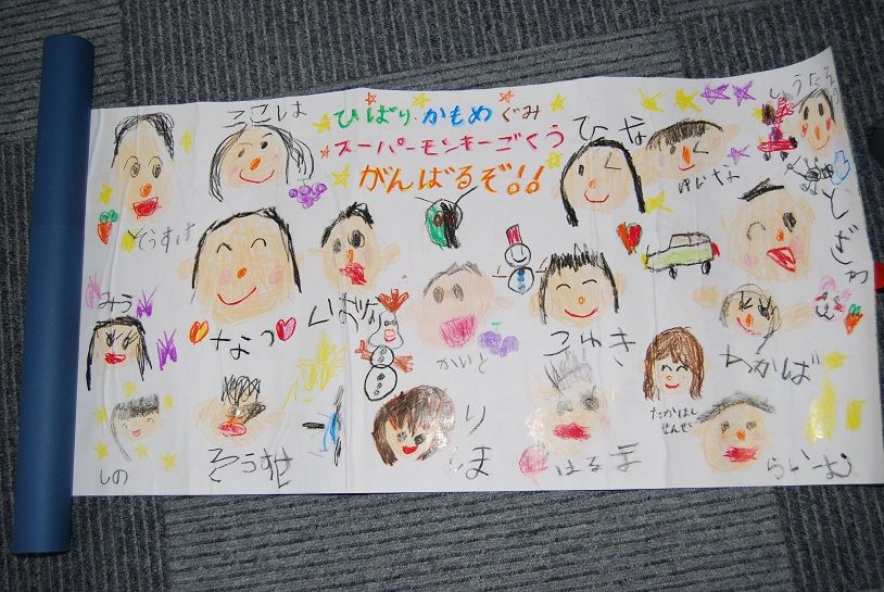 明日は、いよいよ… 2016年02月19日 明日は、いよいよ生活発表会 『ドキドキするね』 『楽しみだね』 と、言いながら最後の練習をしました ひばり・かもめ組は、 おはなしミュージカル【スーパーモンキー悟空】 を行います おはなしの中で、重要なのが この【不思議の巻物】です この巻物、何が書いてあるかというと みんなの似顔絵なんです 『僕の顔はこんな感じかな』 『好きな物も一緒に描こう』 みんなの思いがたくさん詰まった不思議の巻物 今日まで、たくさん練習してきました 明日の本番、どうぞお楽しみに 『頑張るぞー オー』