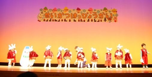 ♪生活発表会・ふくろう組♪ 2016年12月31日 一時保育で遊びに来てくれている、ふくろう組さんのお友達も参加してくれました 「遊戯・うさぎ野原のクリスマス」です 大きな舞台にちょっぴりビックリしているようでしたが・・・ かわいいウサギさんに変身して、上手にお遊戯を踊ってくれました