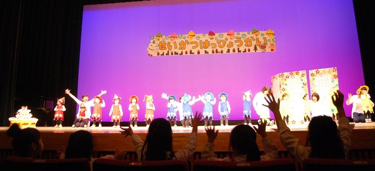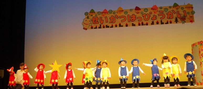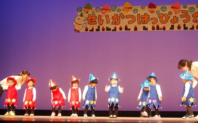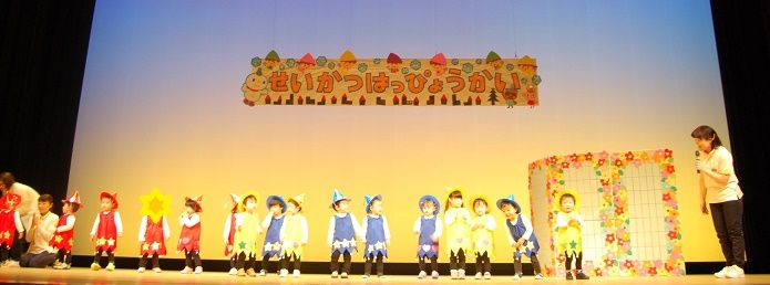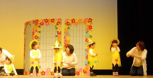 ♪生活発表会・ぺんぎん組♪ 2016年12月31日 ぺんぎん組さんは、 「劇遊び・遊戯 まほうのとびら」です 赤・青・黄色の小人に変身したぺんぎん組さん みんなで冒険に出かけます リトミックや手遊びをそれぞれ披露してくれました 最後は、みんなでお遊戯「まほうのとびら」を踊ります 観客席のお姉さんたちも一緒に踊ってくれています ドキドキしているお友達もいましたが・・・泣かずに最後まで頑張りました
