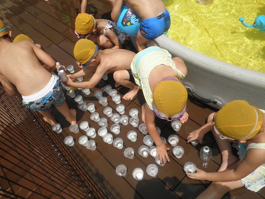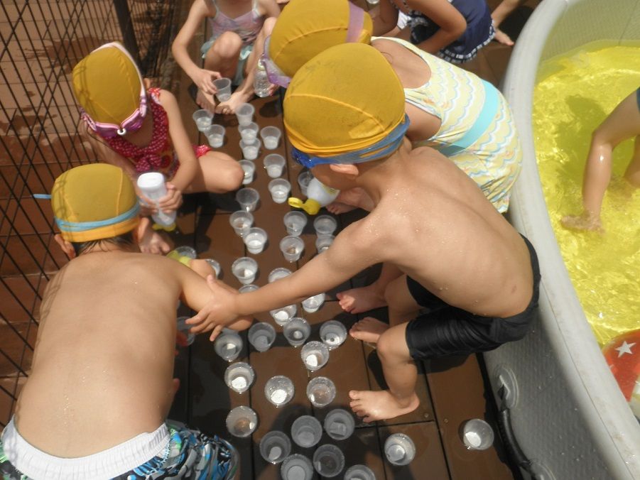 かもめぐみ プールあそび 2018年07月16日 こんにちは 暑い日が続きますが、こどもたちは元気いっぱい 先日のプール遊びでは、暑さを吹き飛ばすほど、とっても楽しそうでした 何でもおもちゃにしてしまうところは、すごいですね ちなみにこれは、ジュースやさんだそうです