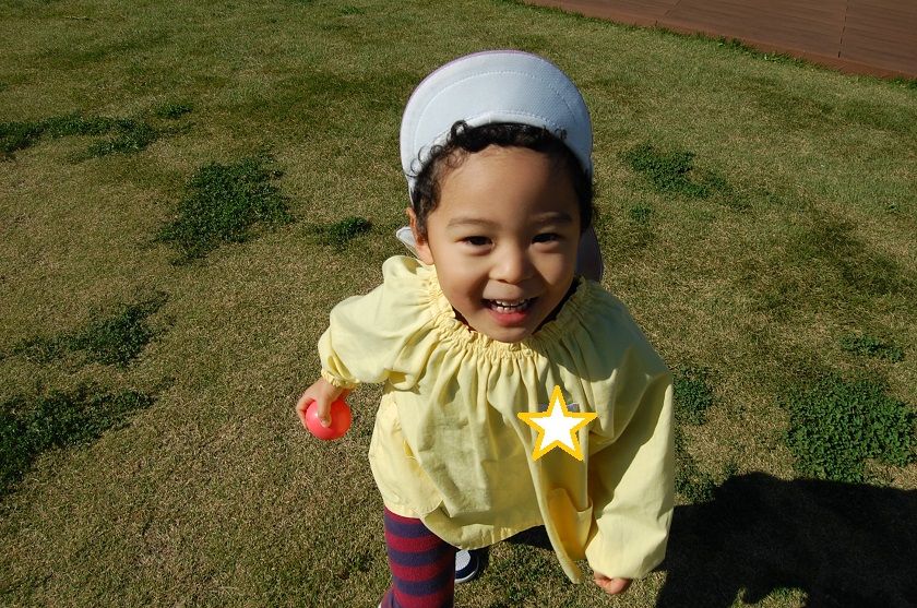 コミュニティの芝生で体をいっぱい動かして遊びました