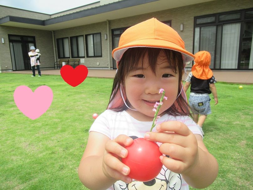 コミュニティの芝生では、お花を探したり、ボール遊びを楽しんでいます