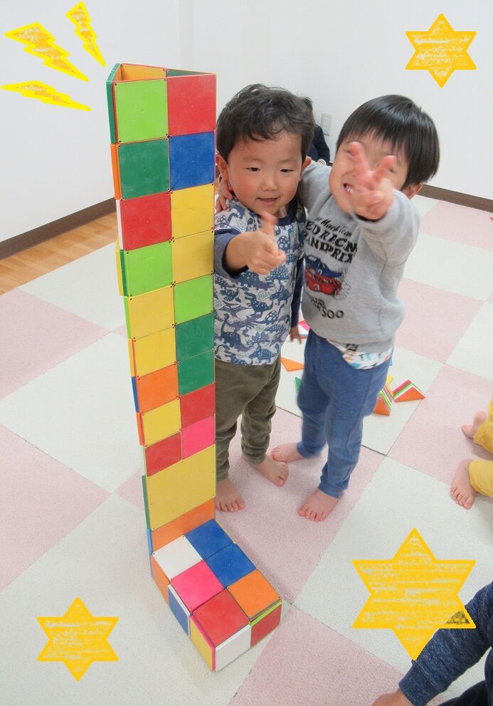 ふくろう組☆ピタゴラス 2019年11月23日 朝の時間にピタゴラスを出して遊びました 今回は2歳児のお友達をモデルさんにしています 『これで遊ぶよぉ~』 同じ形を並べて違う形を作ったり『ピザ』です 立体的な箱を作って見せてくれたり 手を伸ばして自分の身長よりも高いものを作ってる子もいました超大作です凄いっ お友達も一緒に『ハイポーズ』よく頑張りました 2歳児さんは作る物も大きくなったり立体的だったりするので成長に驚かされます